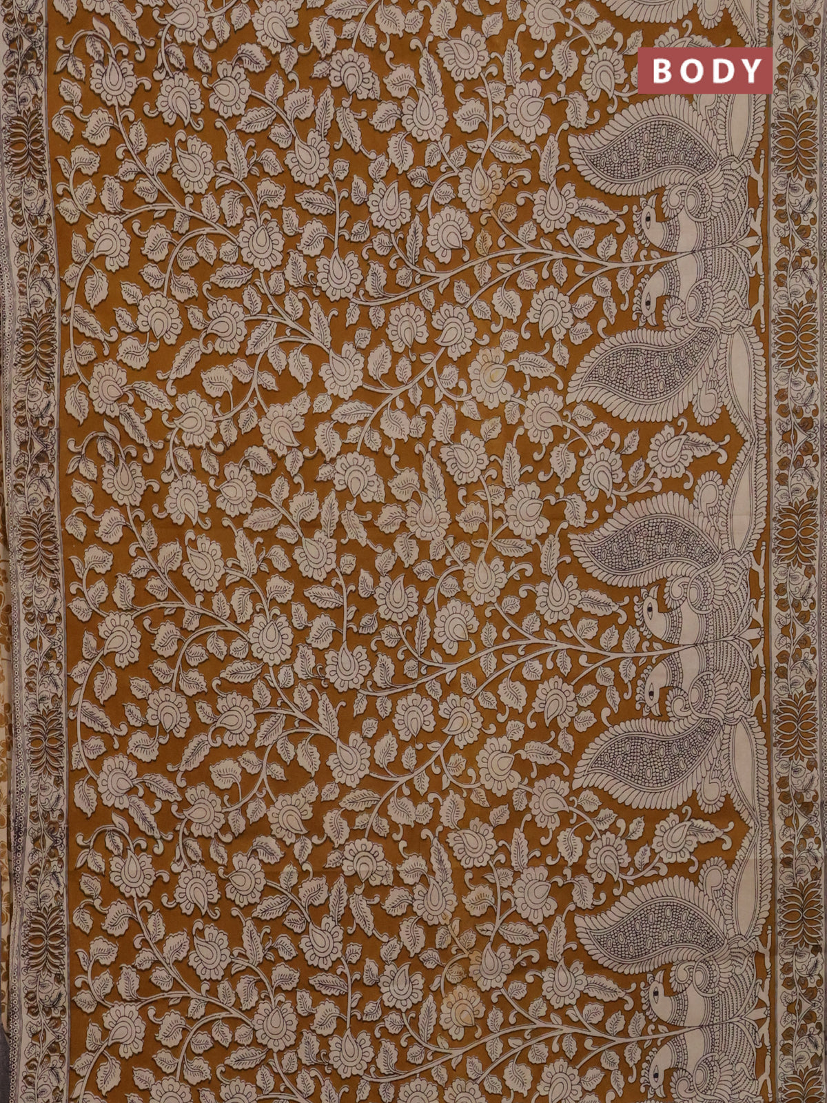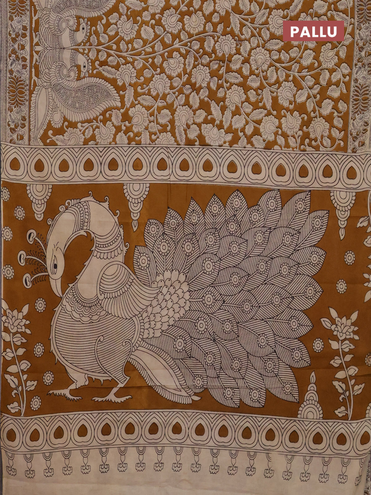 Kalamkari cotton saree dark mustard and beige with allover prints and printed border