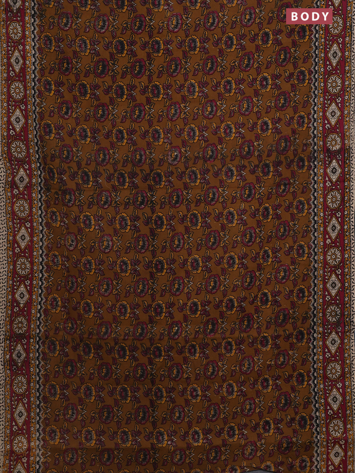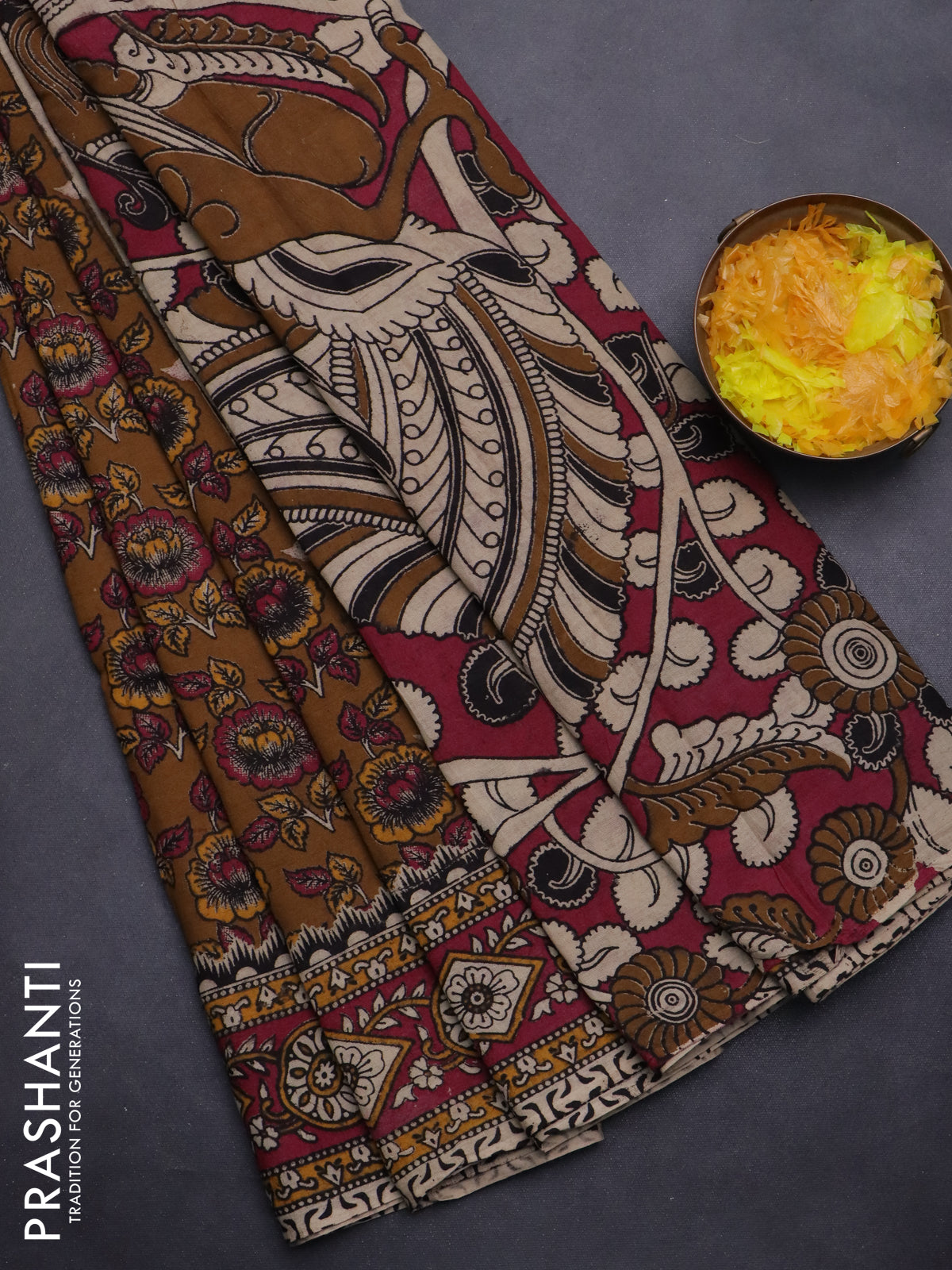 Kalamkari cotton saree dark mustard and dark pink with allover prints and printed border