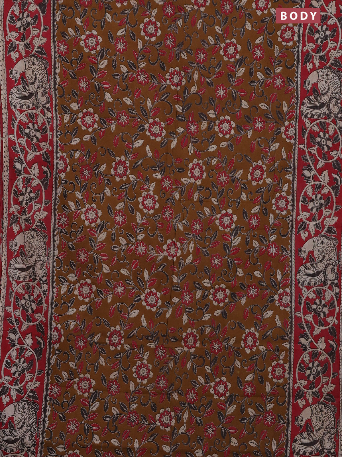Kalamkari cotton saree dark mustard and red with allover prints and printed border