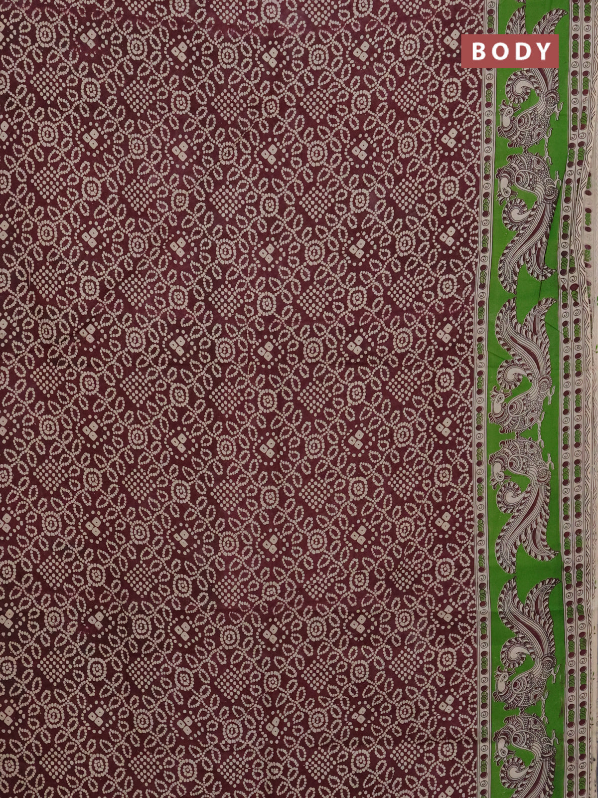 Kalamkari cotton saree deep maroon and green with allover bandhini prints and printed border