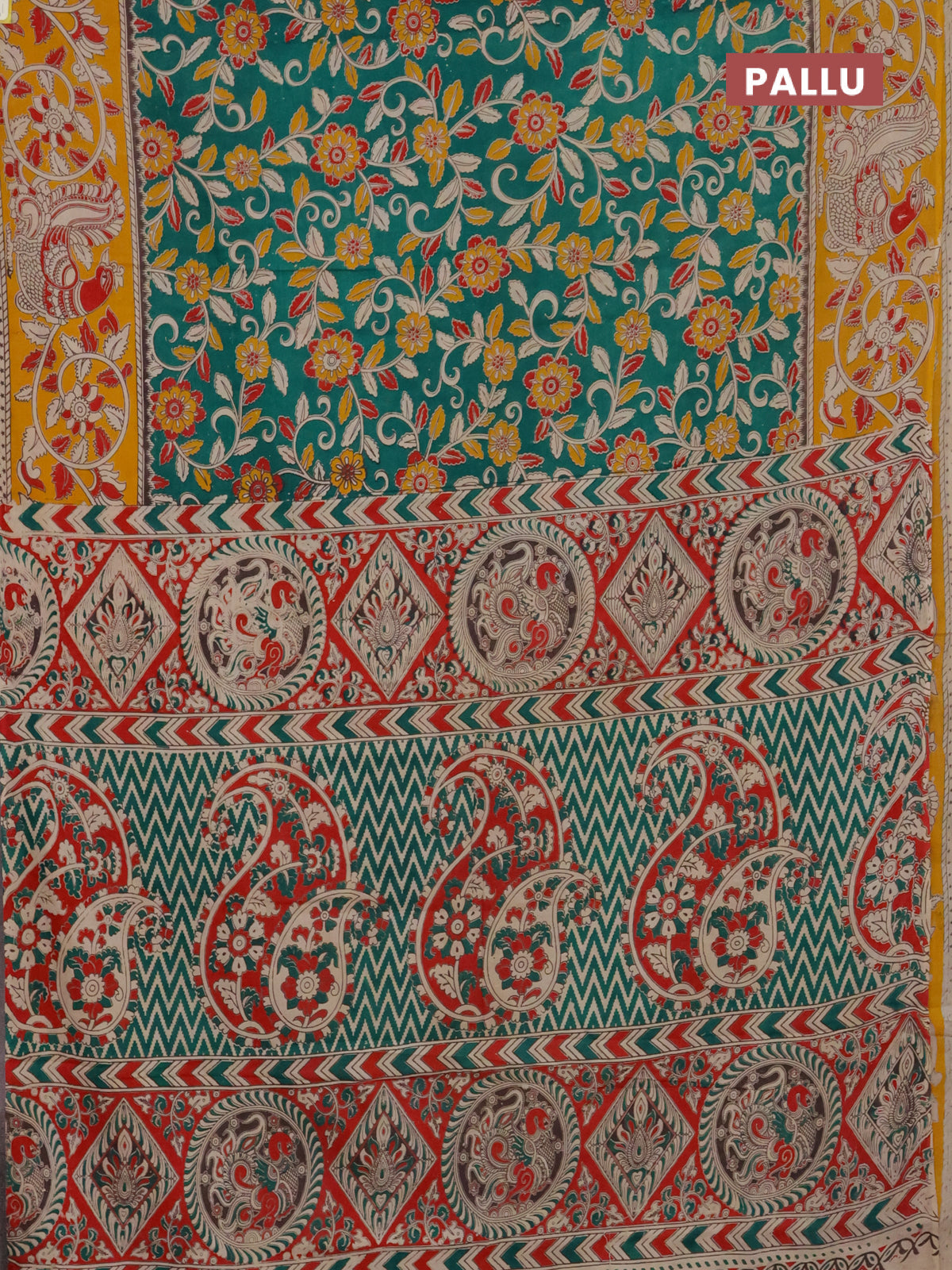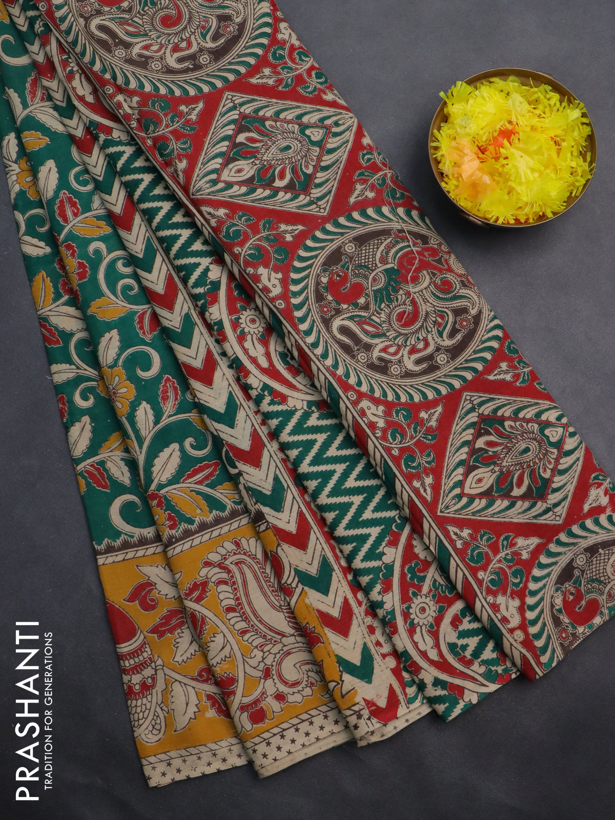 Kalamkari cotton saree green and yellow with allover prints and printed border