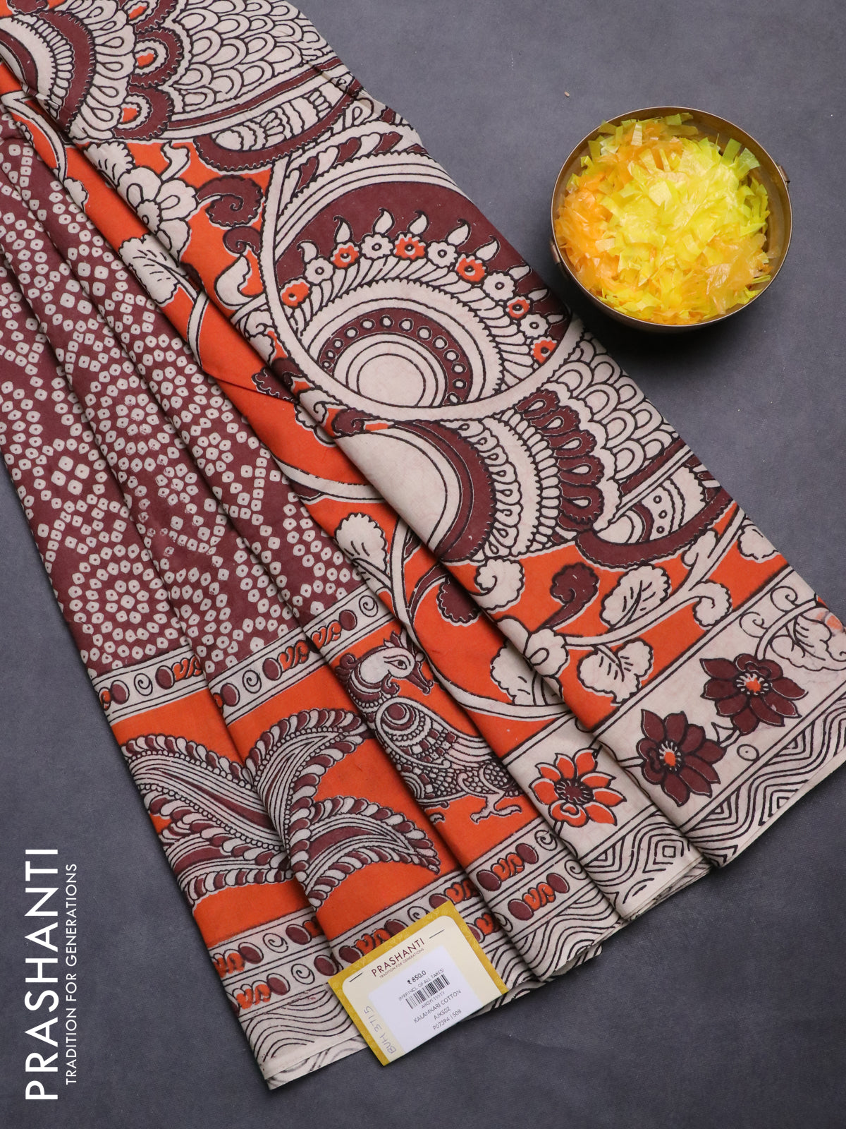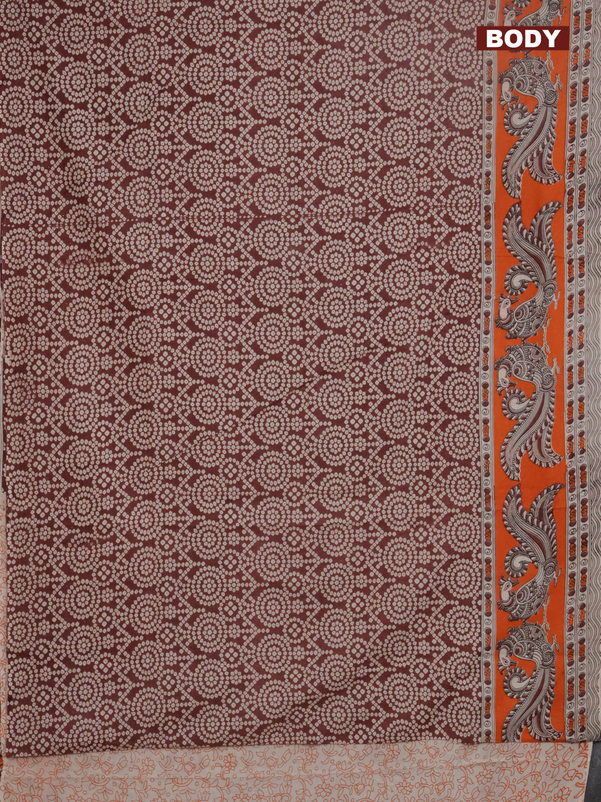 Kalamkari cotton saree maroon beige and orange with allover bandhani prints and printed border