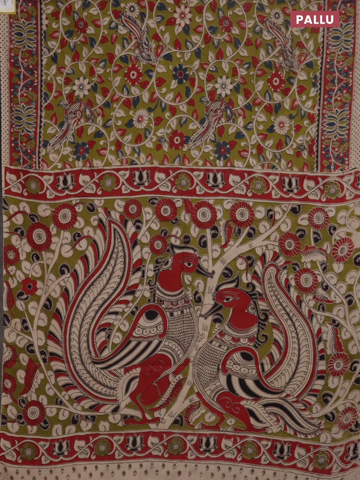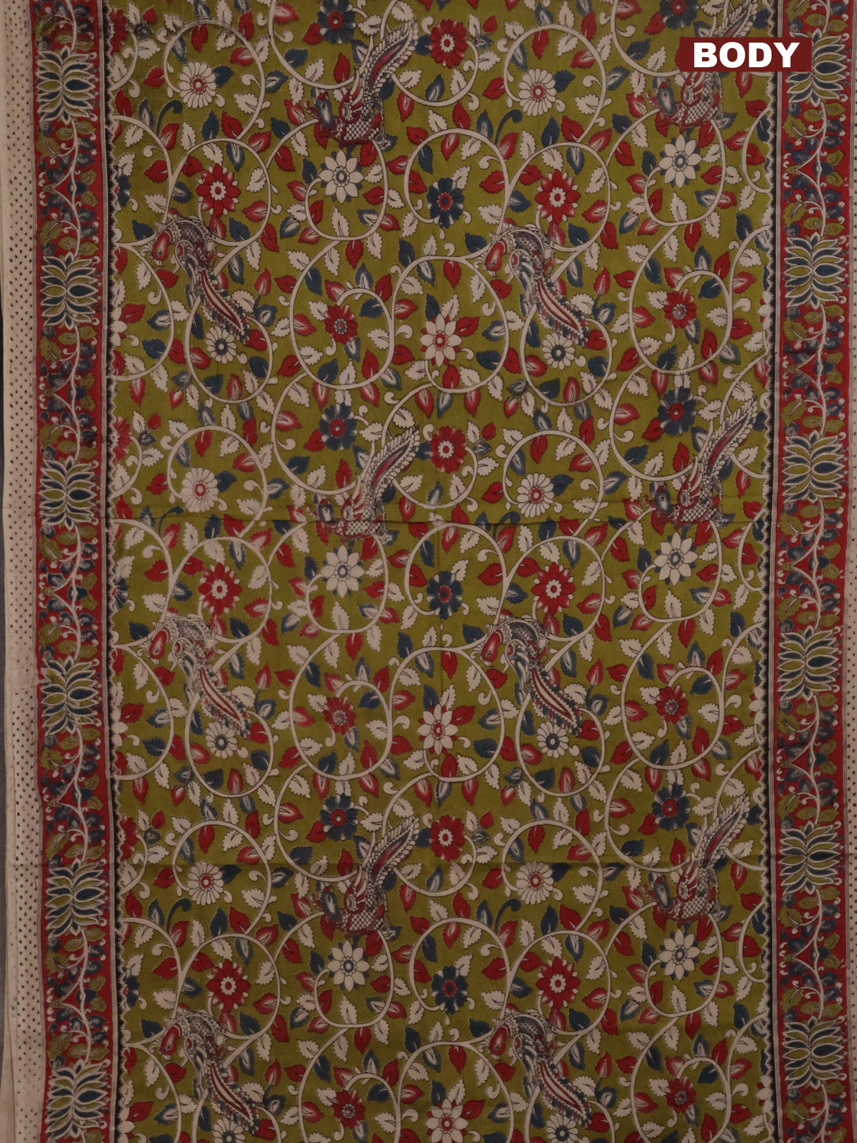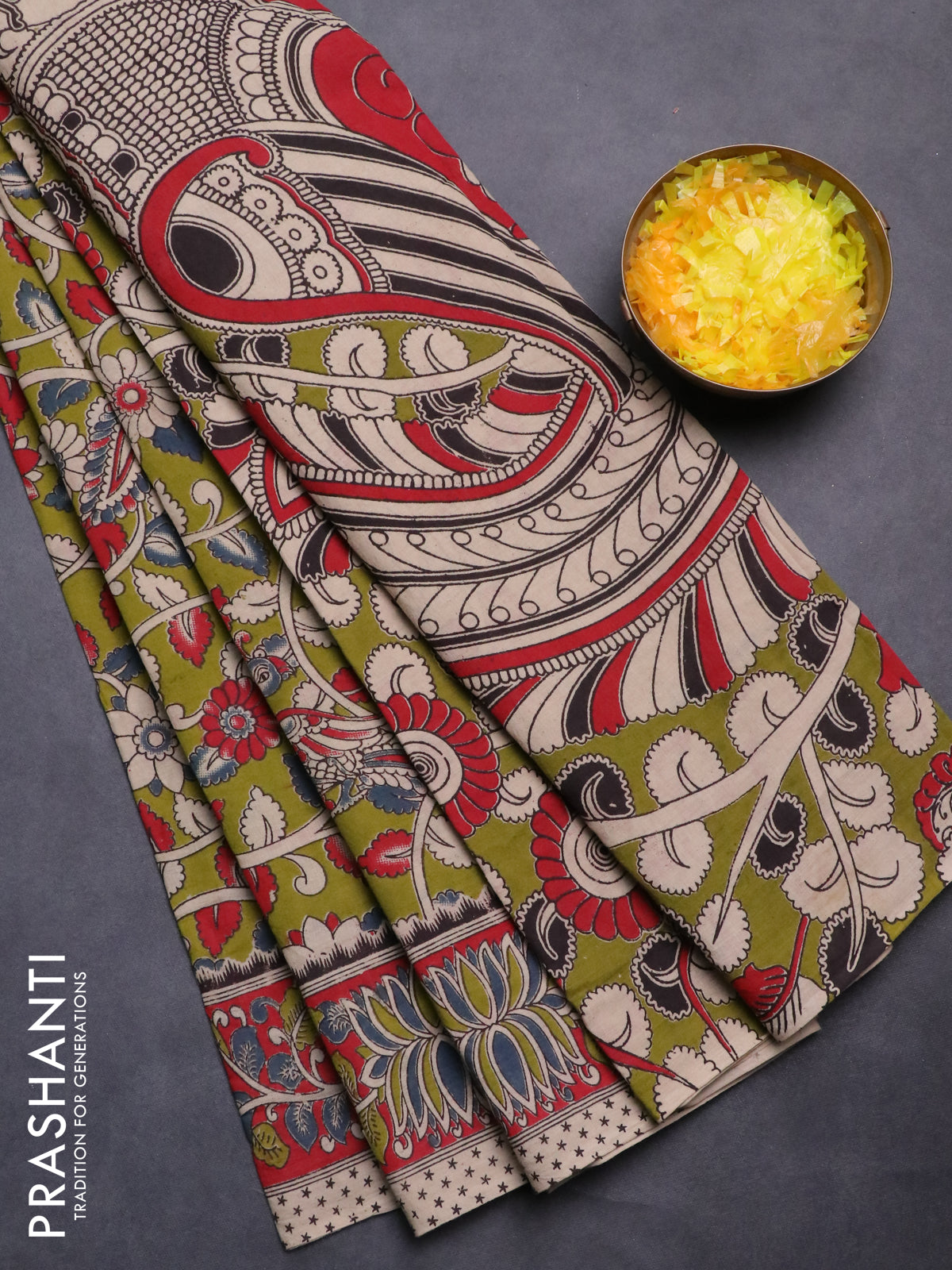 Kalamkari cotton saree mehendi green with allover prints and printed border