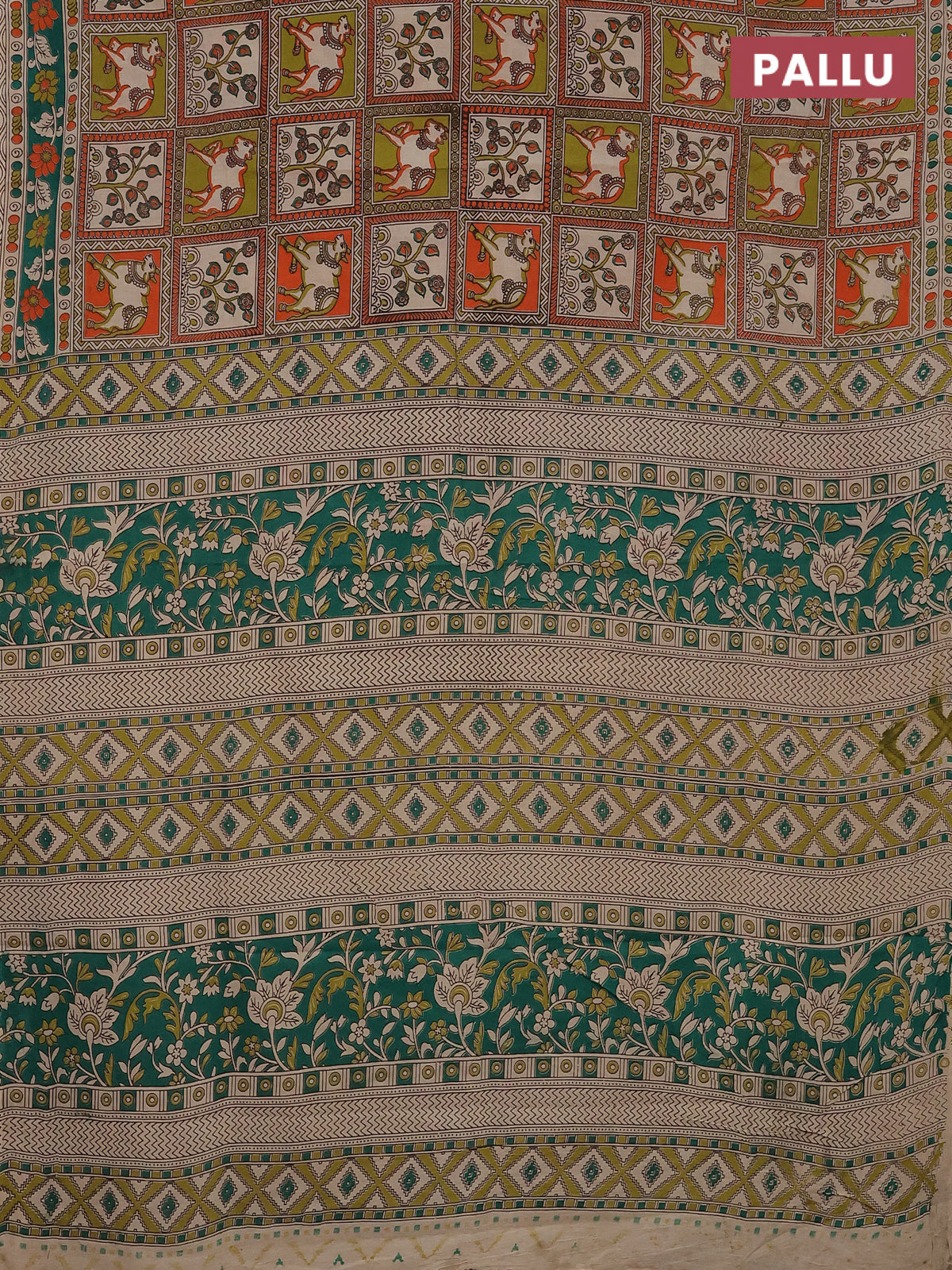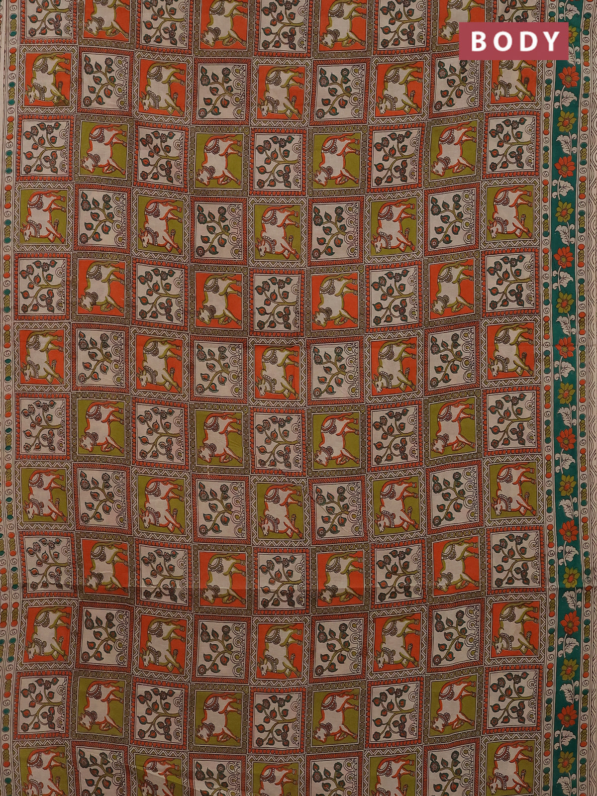 Kalamkari cotton saree multi colour and green with allover prints and printed border