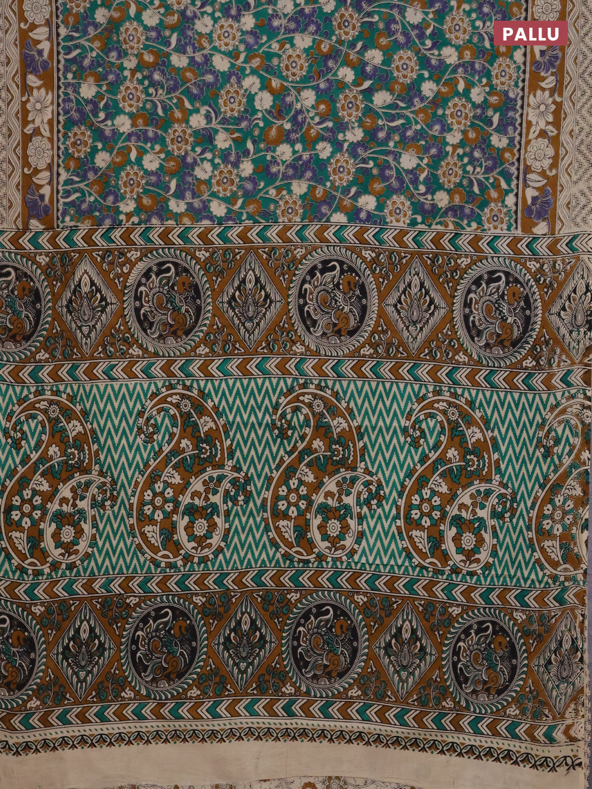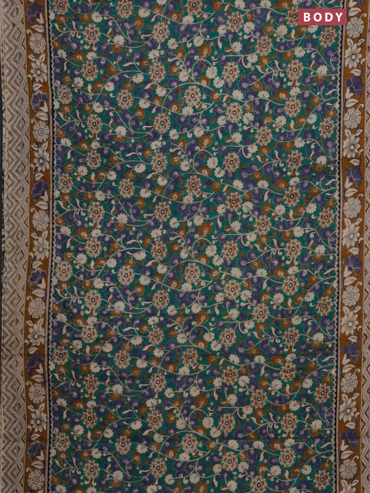Kalamkari cotton saree teal green and dark mustard with allover prints and printed border