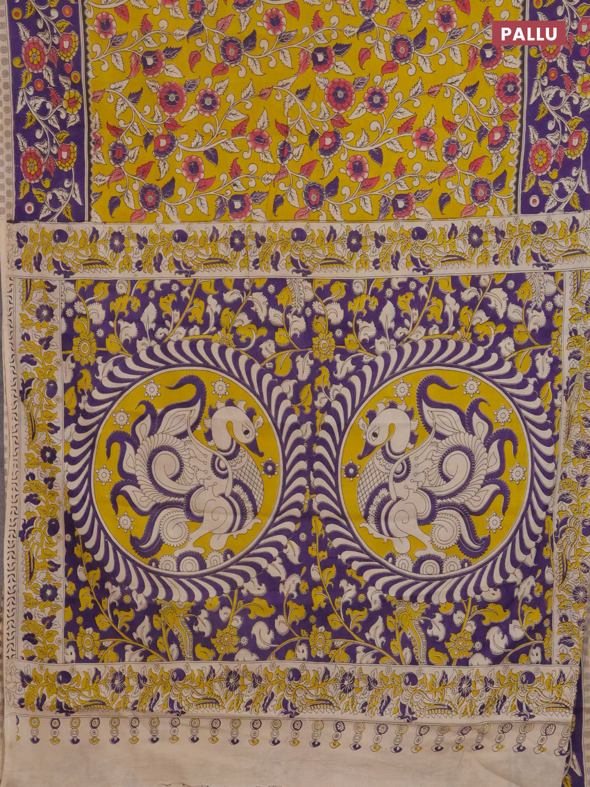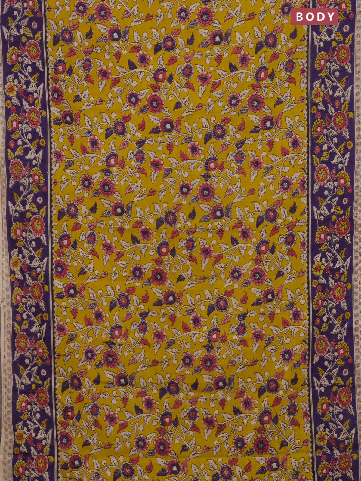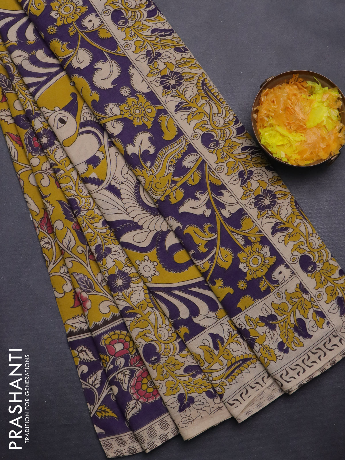 Kalamkari cotton saree yellow and violet with allover prints and printed border