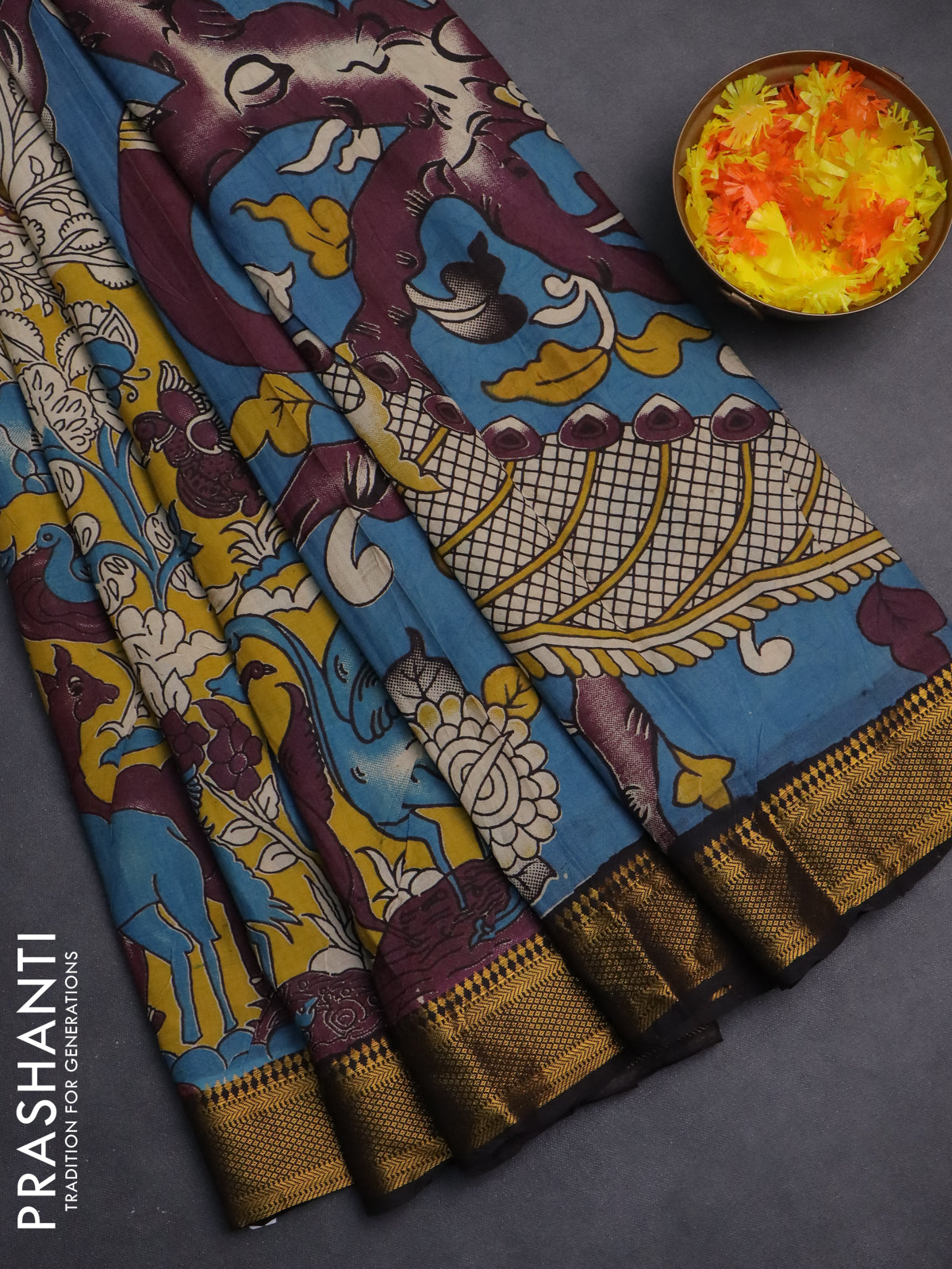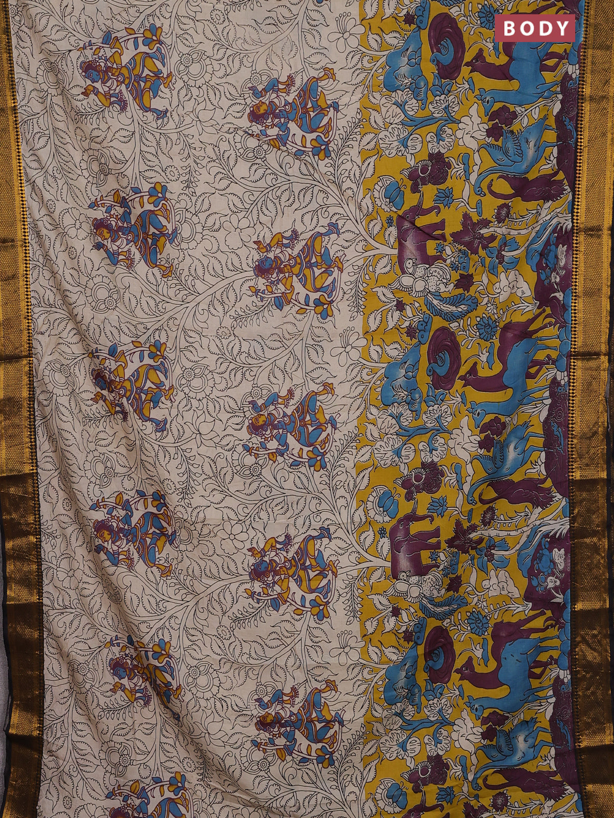Kalamkari semi silk saree beige yellow and black with allover prints and zari woven border
