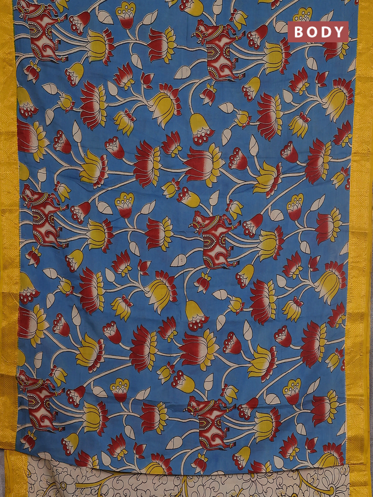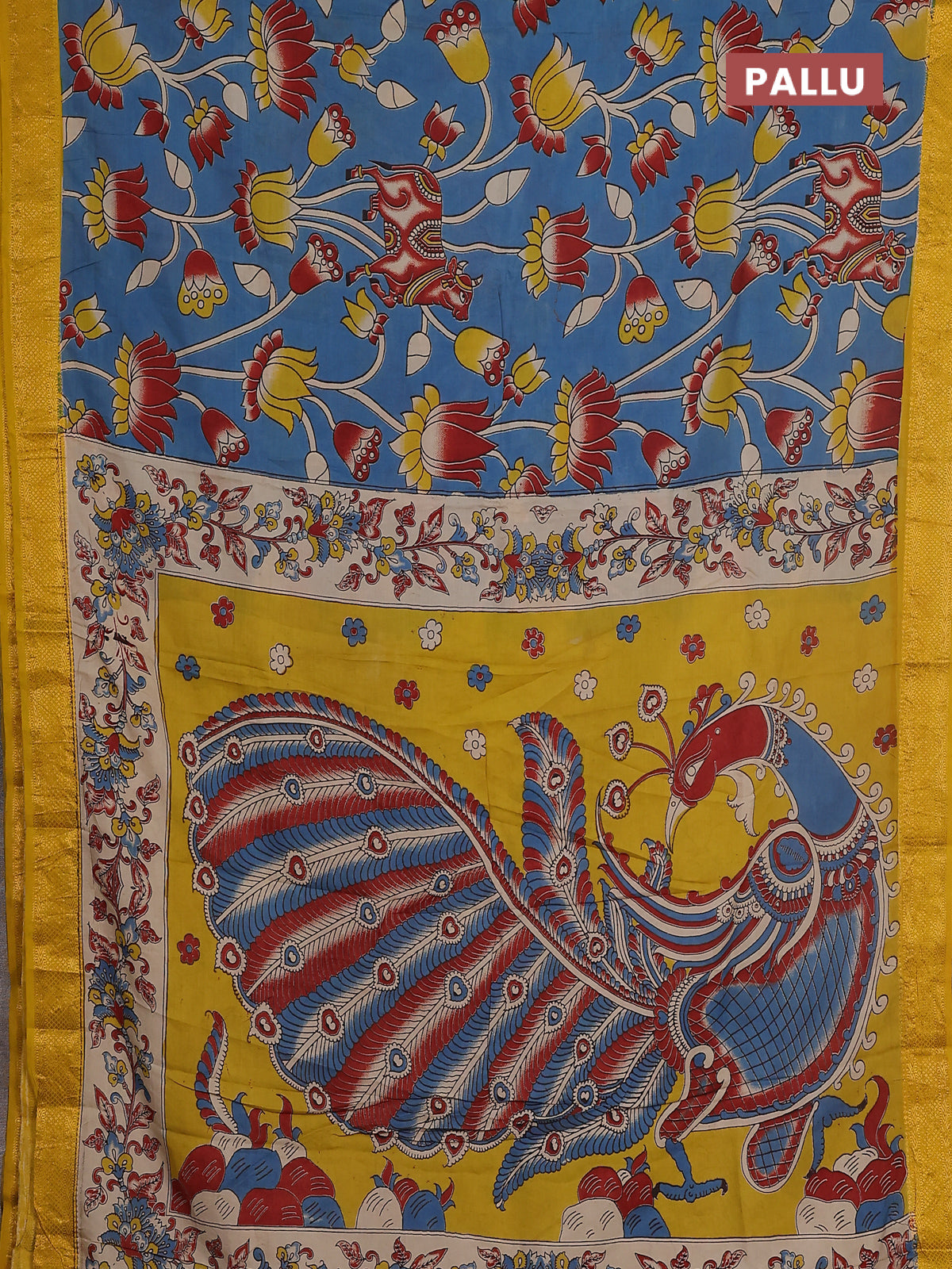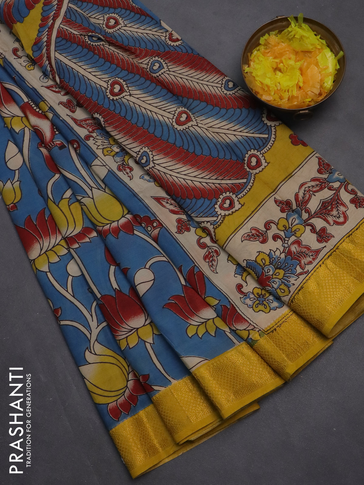 Kalamkari semi silk saree blue and mustard yellow with allover prints and zari woven border