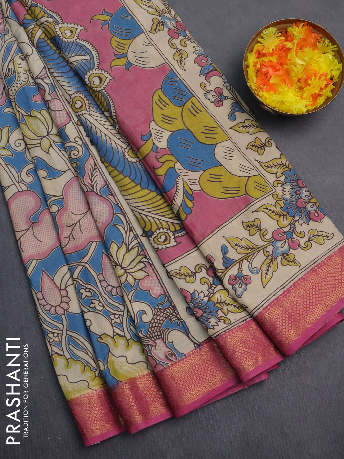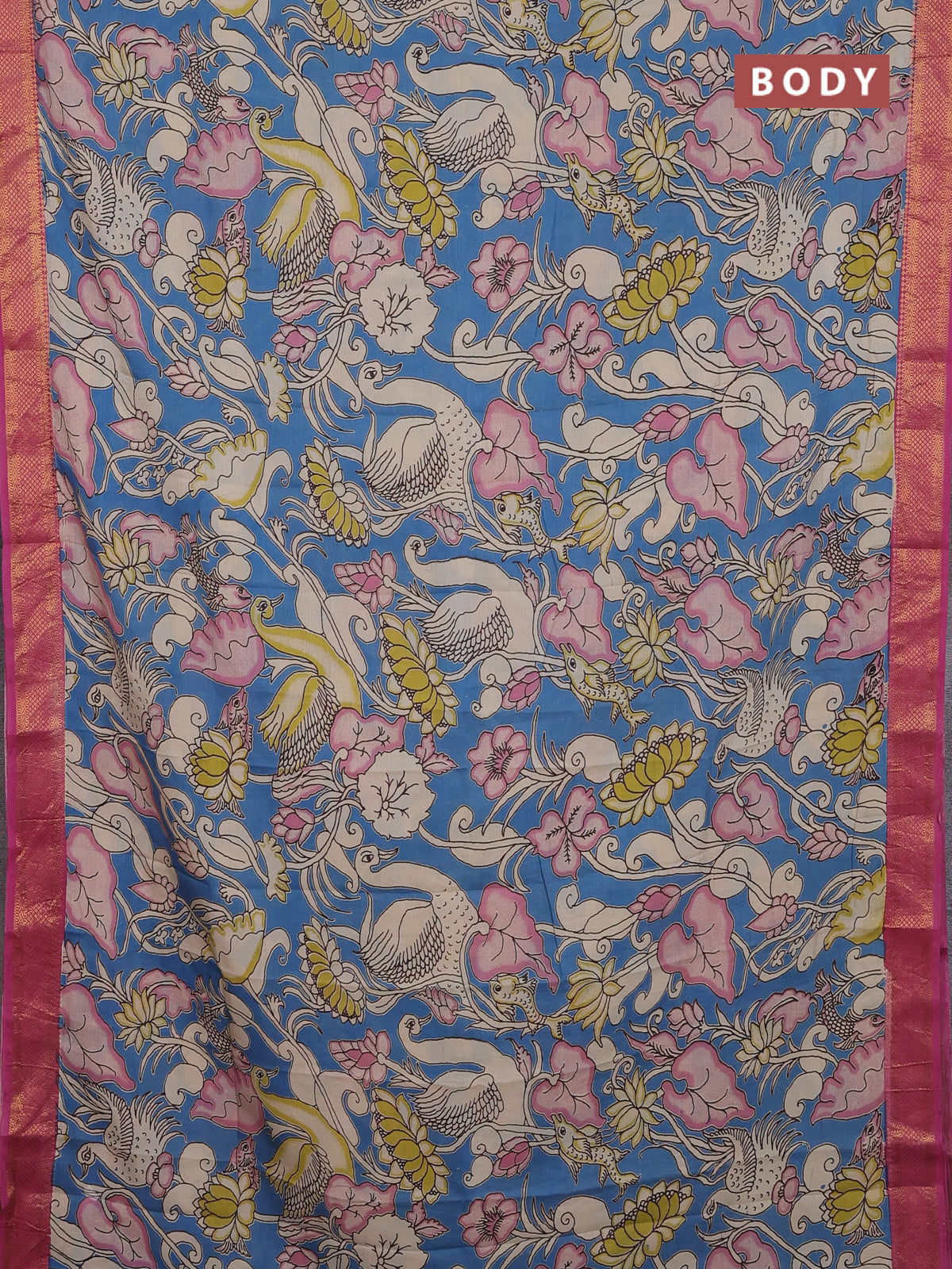 Kalamkari semi silk saree blue and pink with allover prints and zari woven border