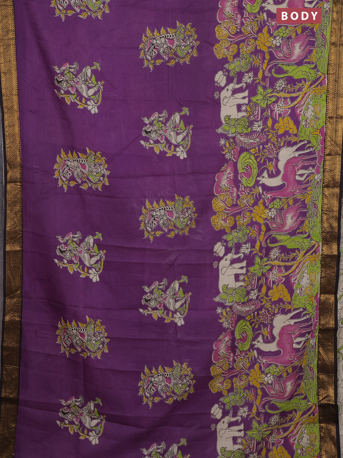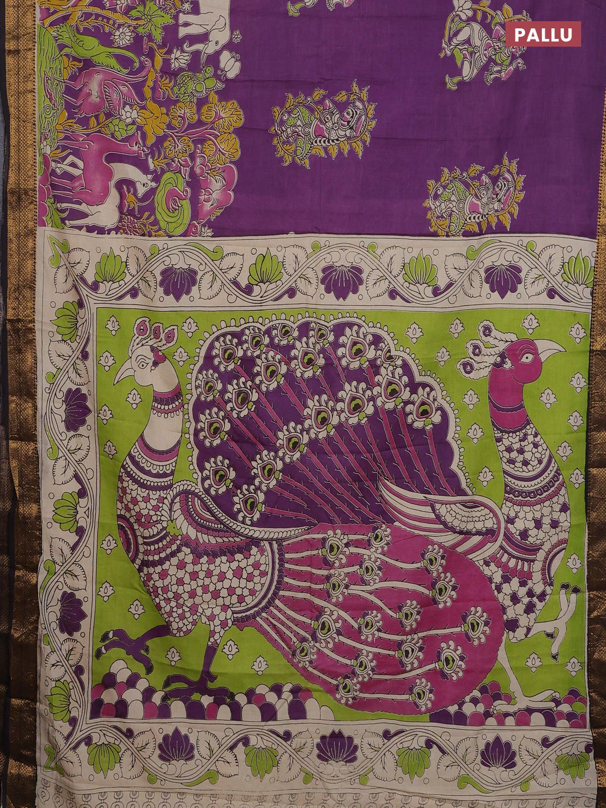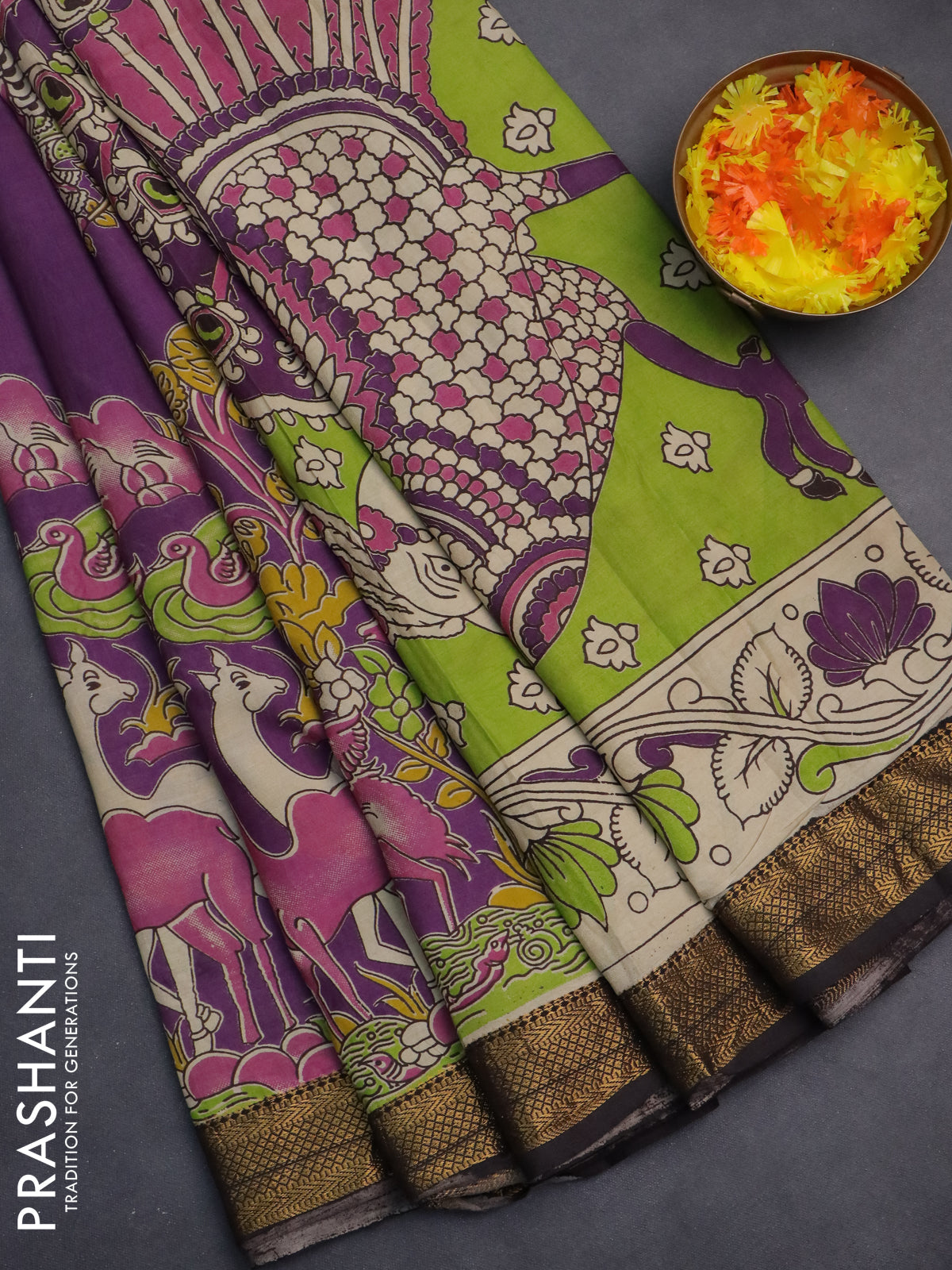Kalamkari semi silk saree purple and brown with allover prints and zari woven border