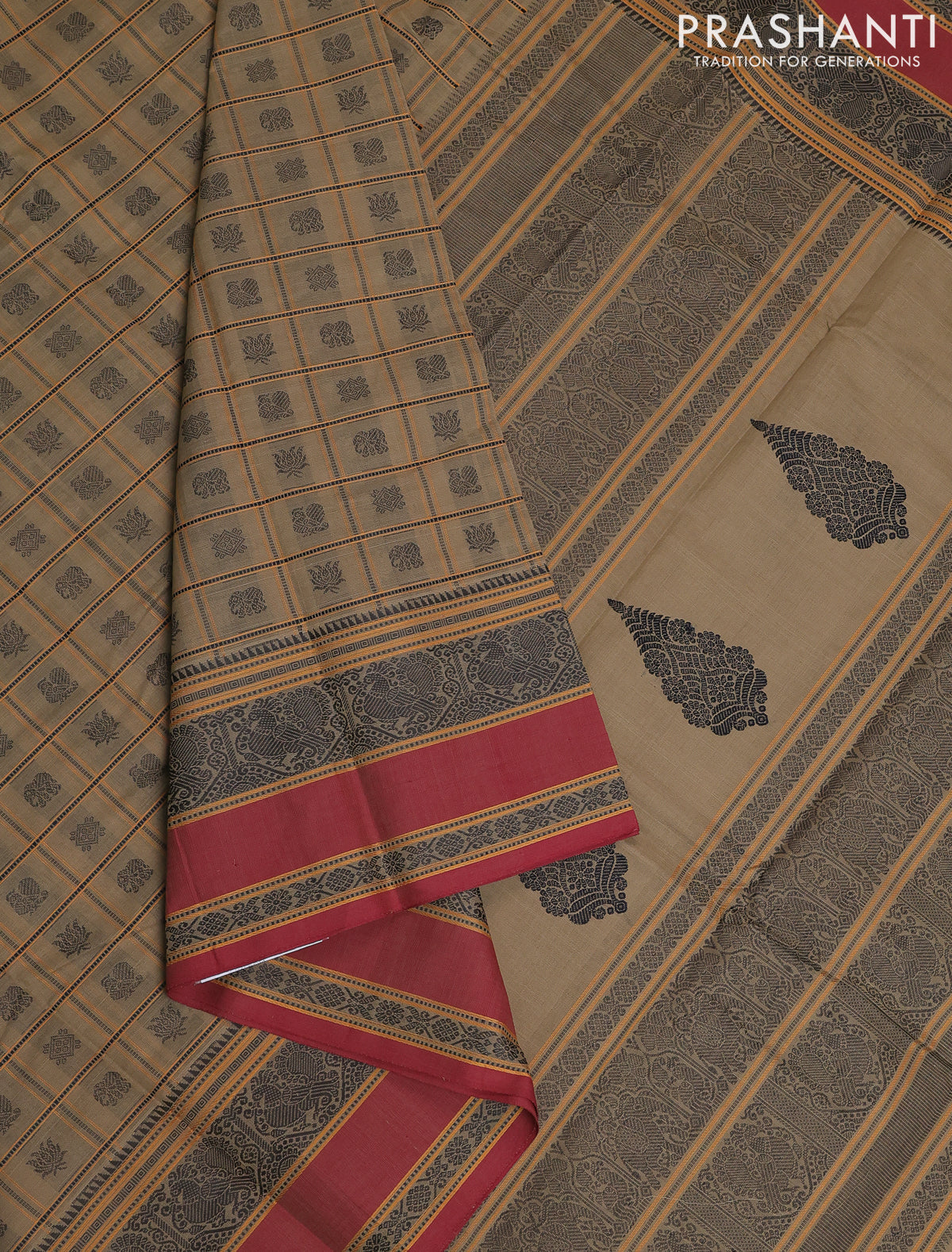 Kanchi cotton saree beige and maroon with allover thread checks & buttas and rettapet thread woven border