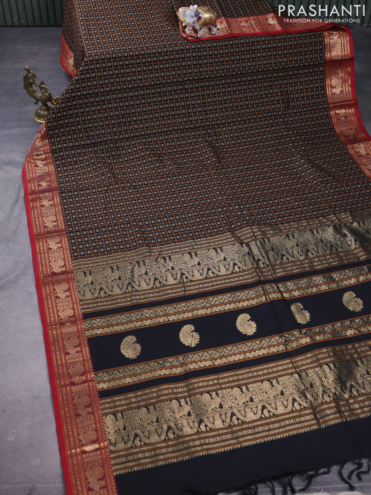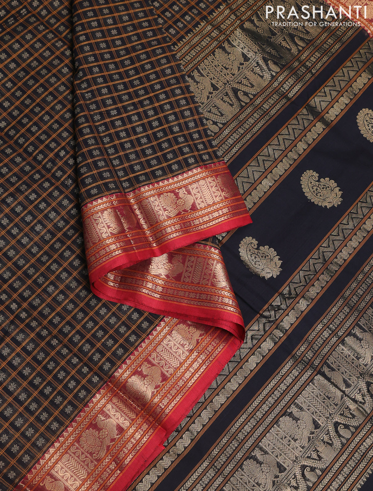 Kanchi cotton saree black and maroon with allover thread checks & buttas and zari woven border