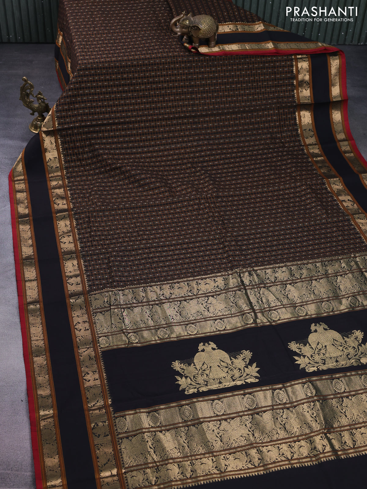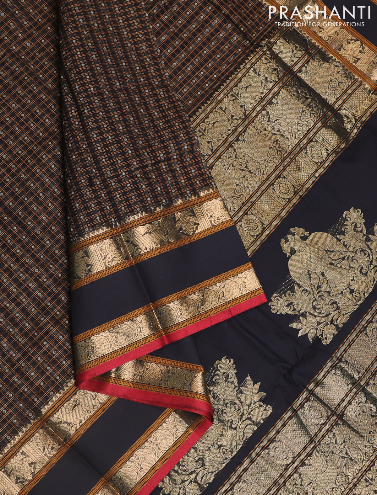 Kanchi cotton saree black and red with allover lakshadeepam weaves and rettapet zari woven border