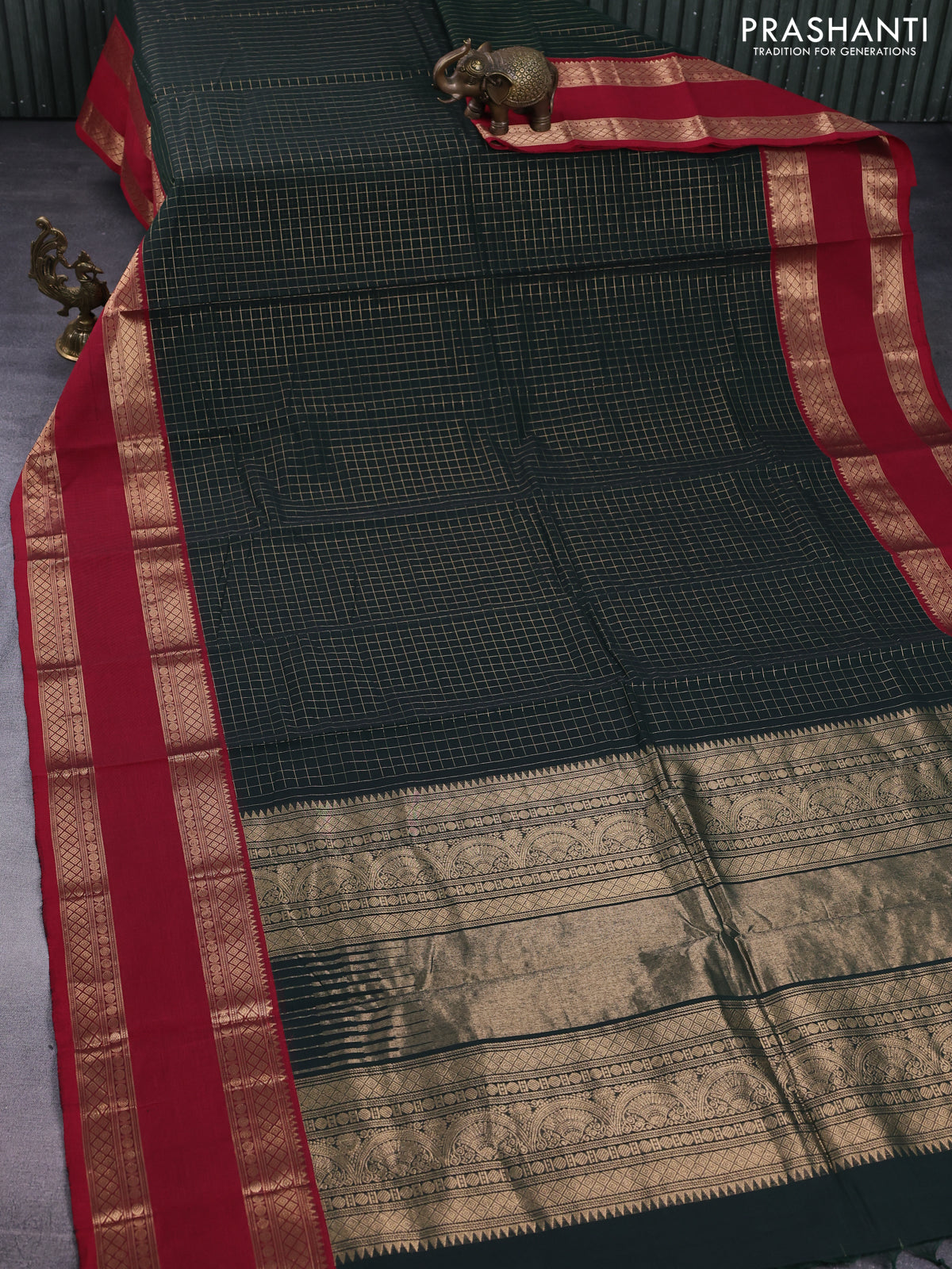 Kanchi cotton saree bottle green and maroon with allover zari checked pattern and rettapet zari woven border