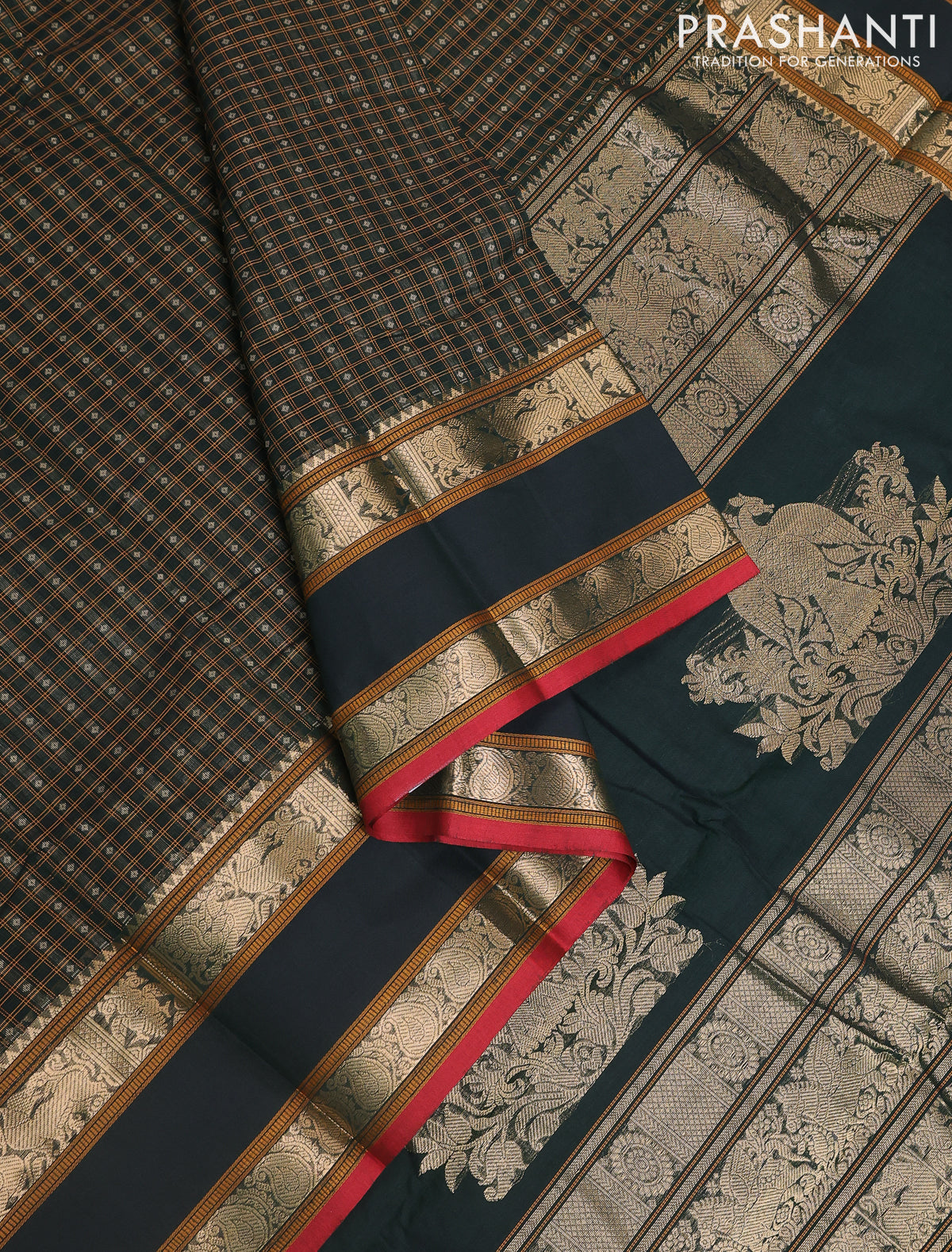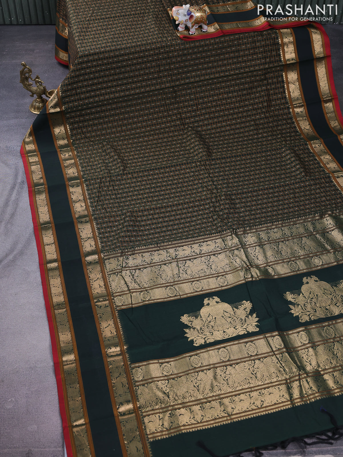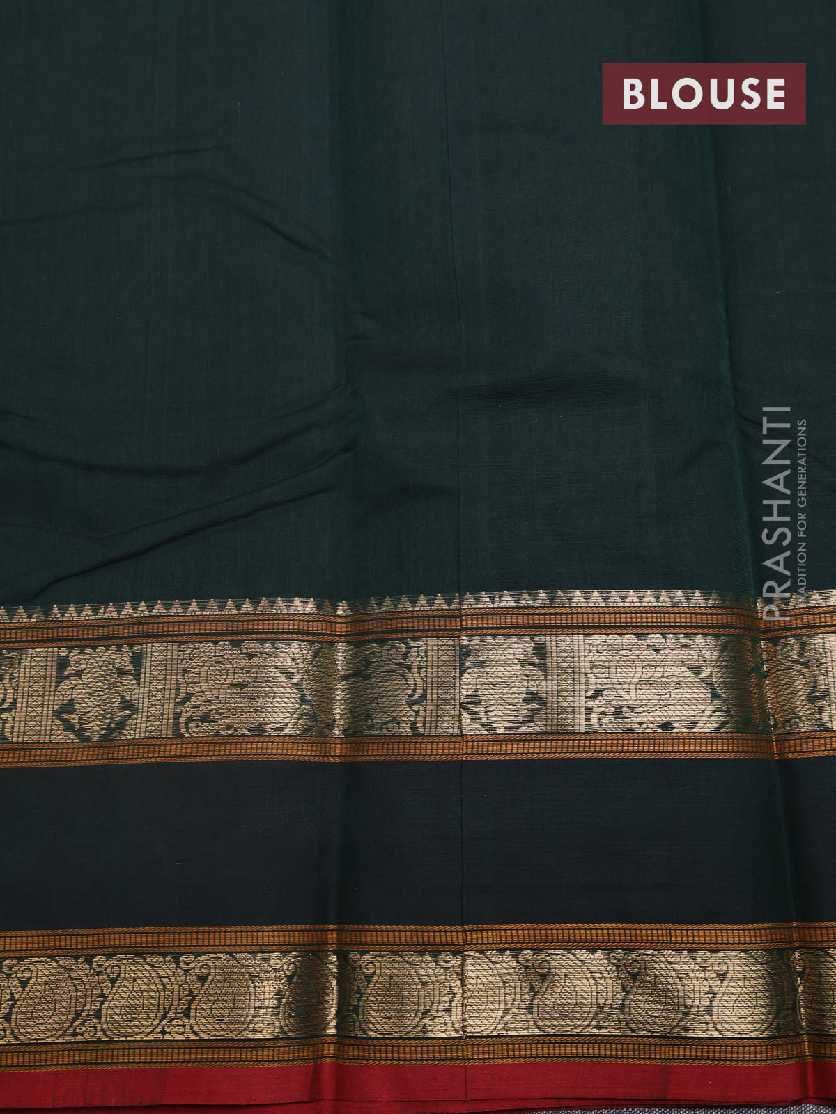 Kanchi cotton saree bottle green and red with allover lakshadeepam weaves and rettapet zari woven border