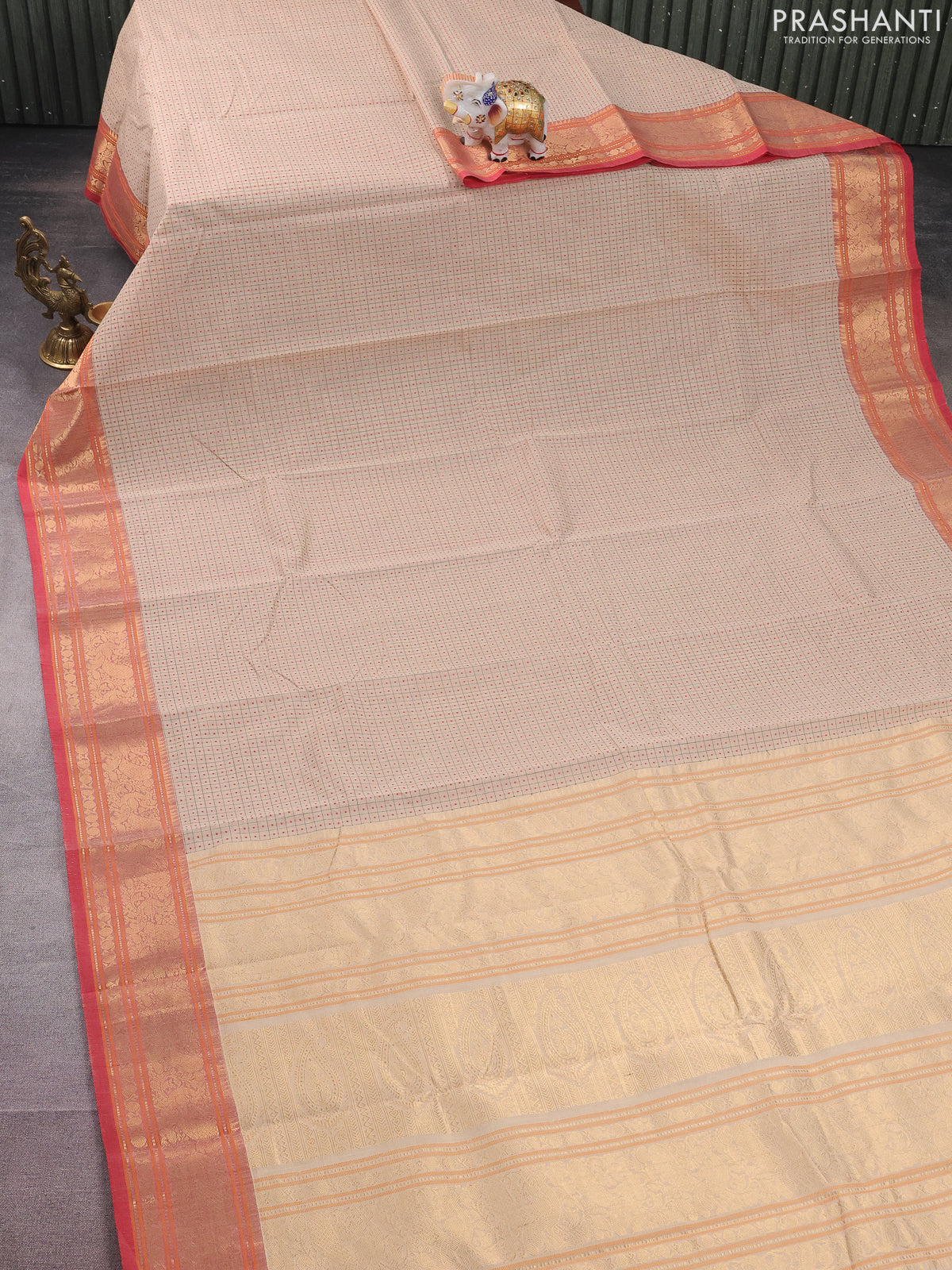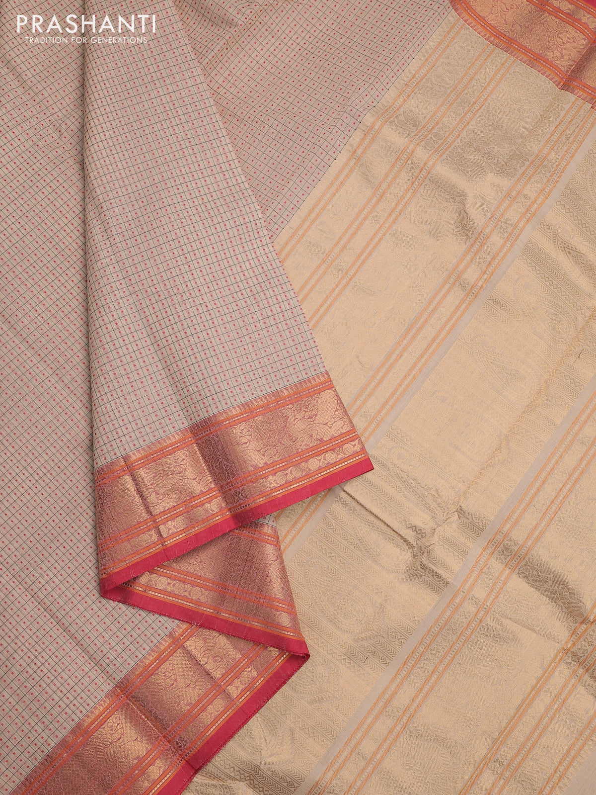 Kanchi cotton saree cream and red with allover checked pattern & lakshadeepam weaves and zari woven border