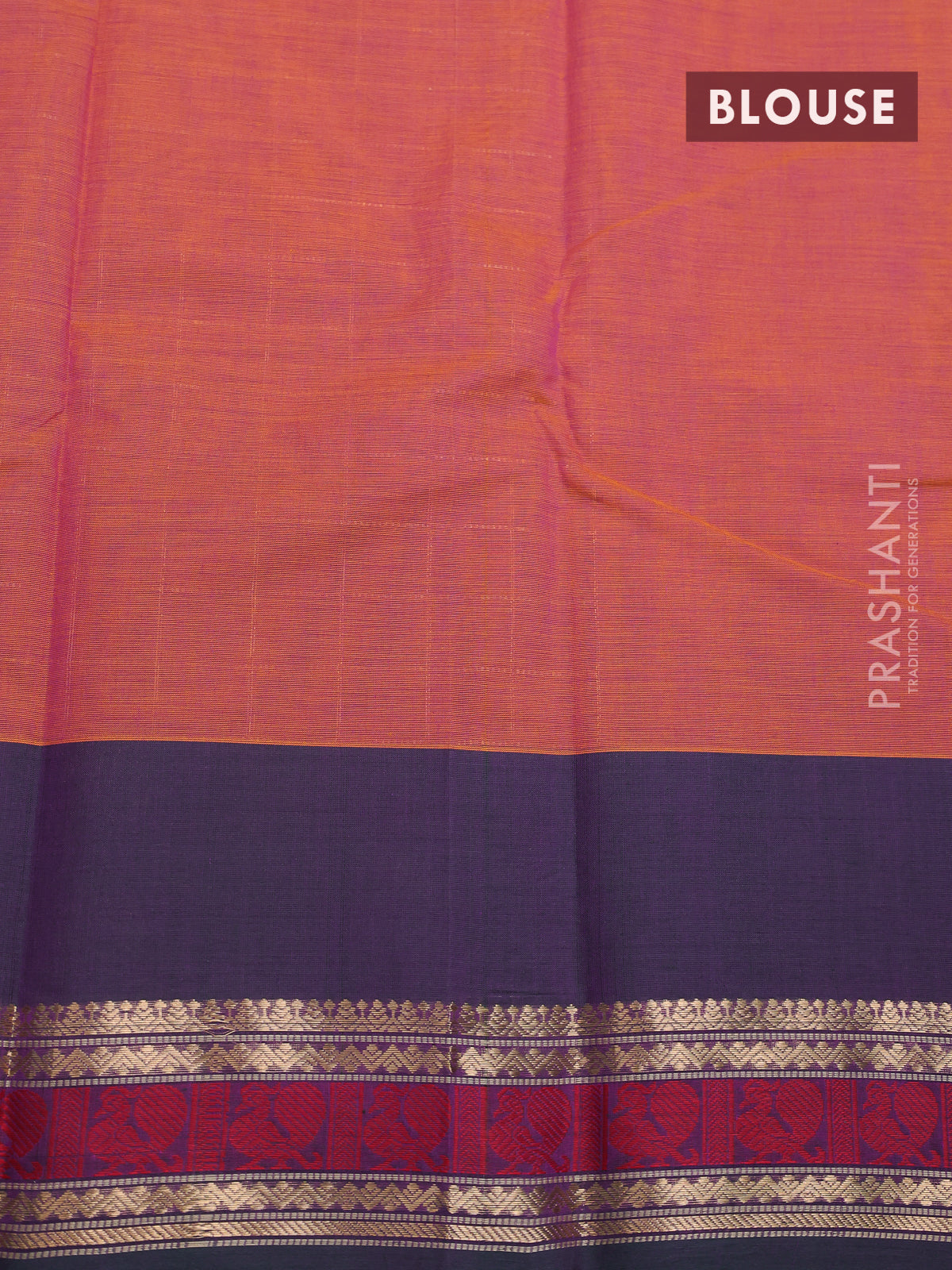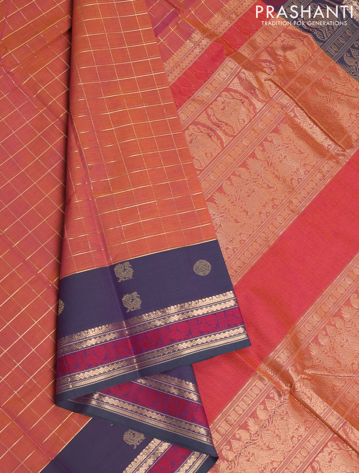 Kanchi cotton saree dual shade of orange and dual shade of green with allover zari checked pattern and thread & zari woven border