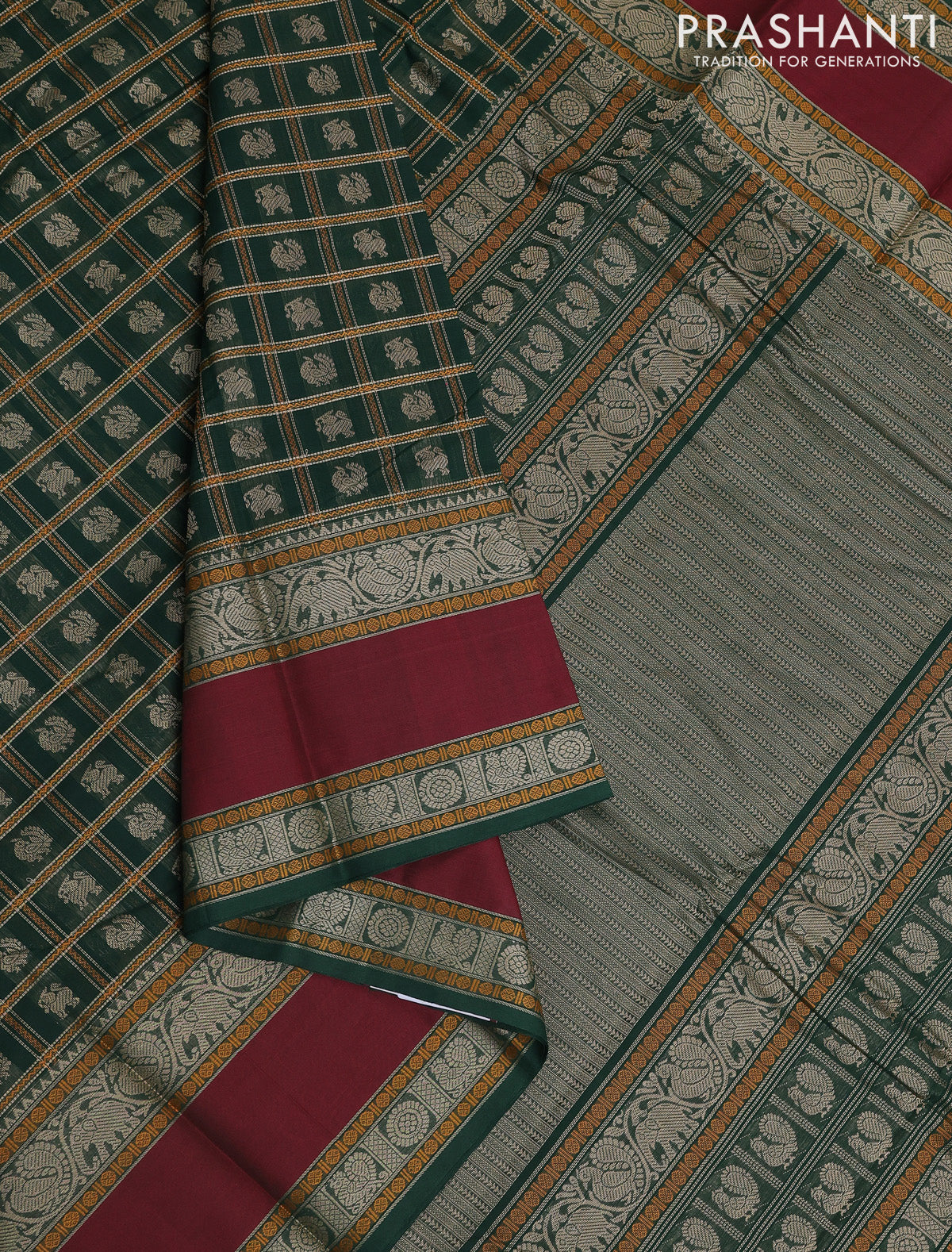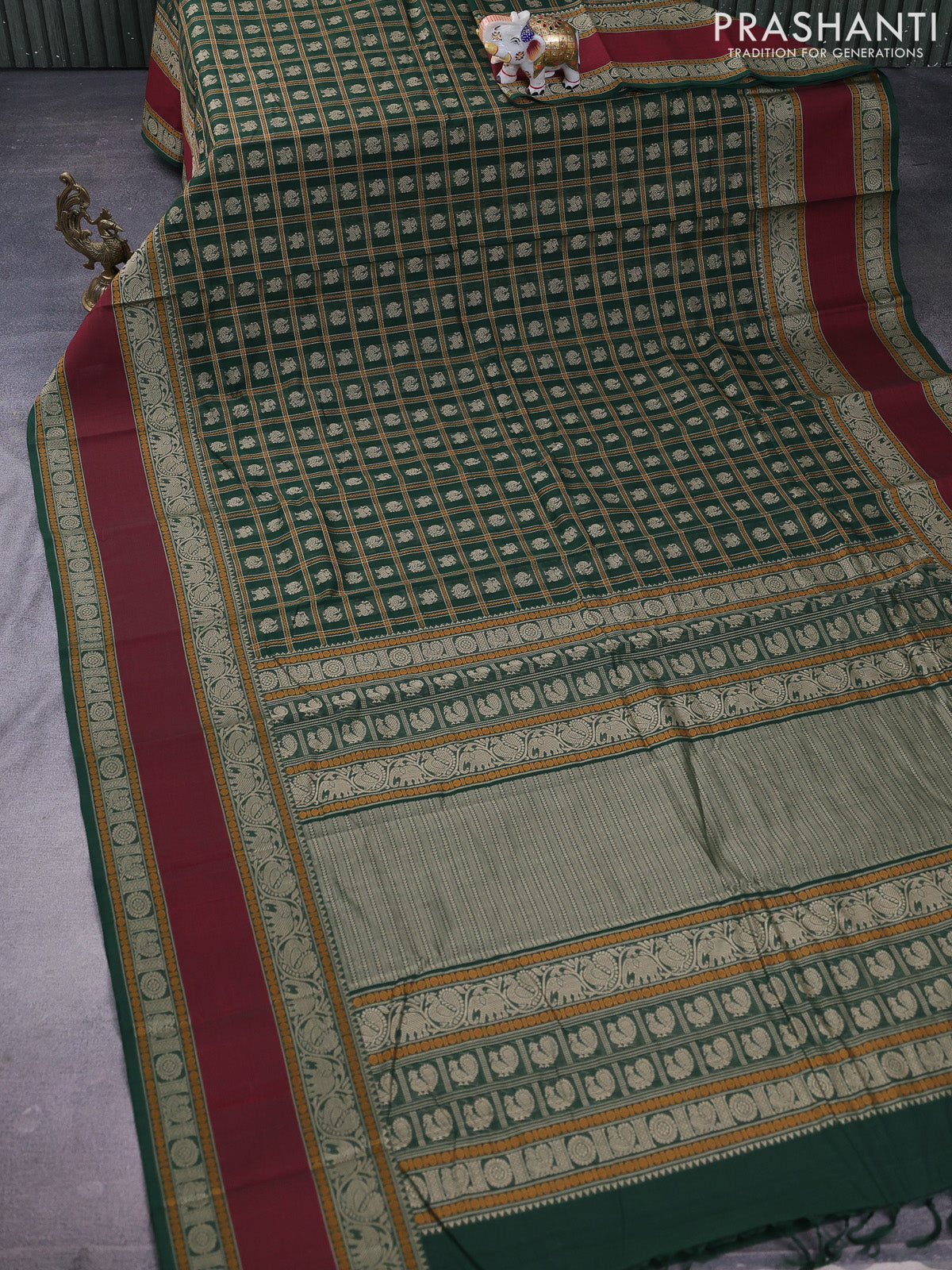 Kanchi cotton saree green and deep maroon with allover thread checks & buttas and rettapet thread woven border