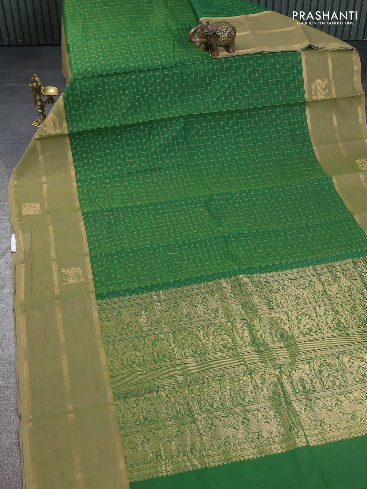 Kanchi cotton saree green and elaichi green with allover thread woven checked pattern and long zari woven butta border