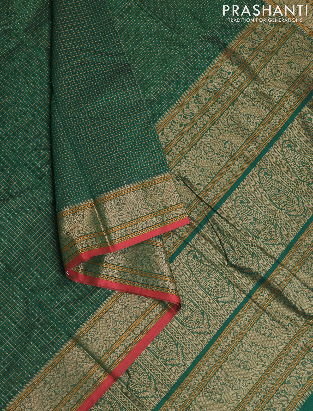 Kanchi cotton saree green and red with allover lakshadeepam weaves and thread woven border