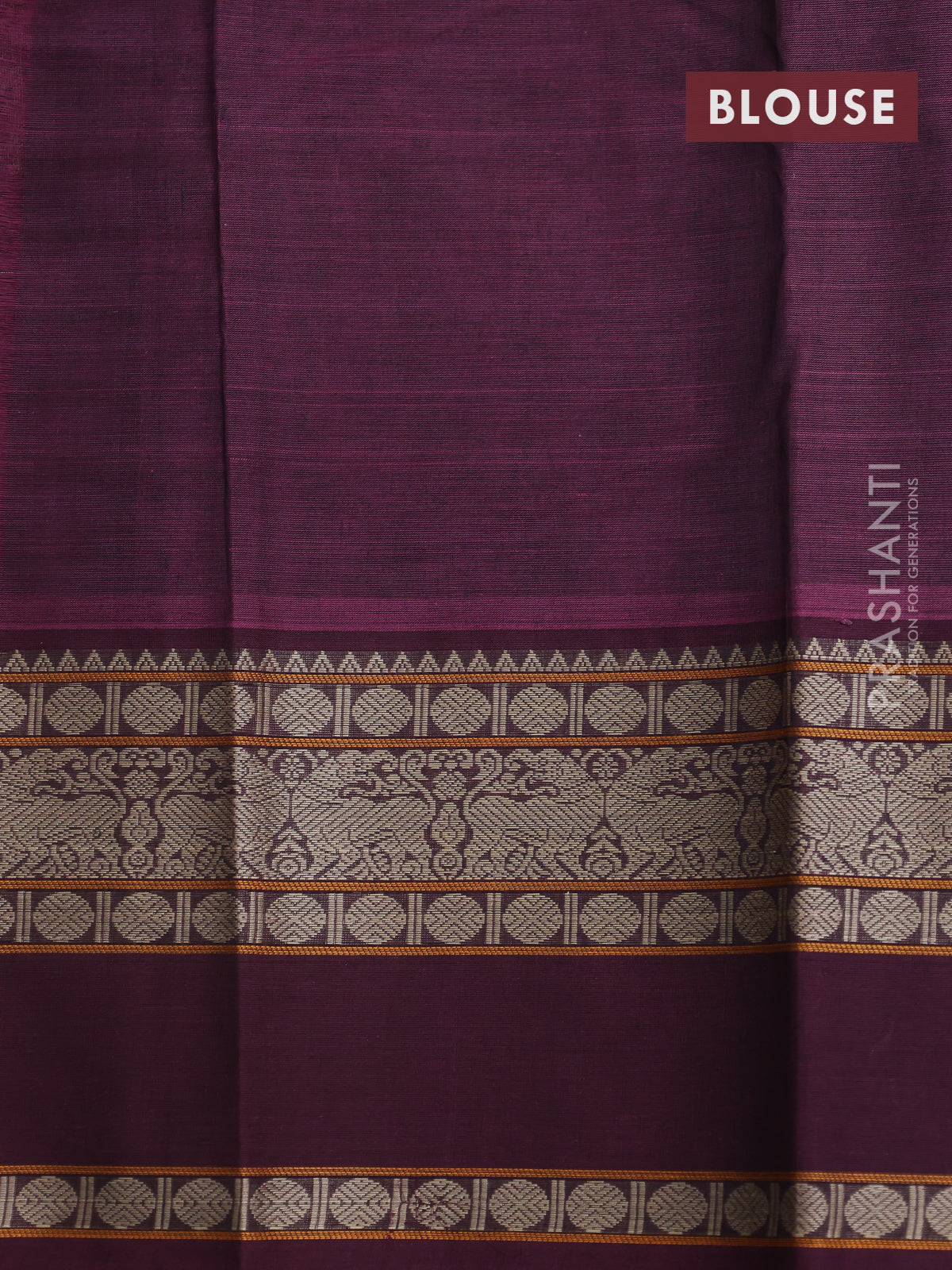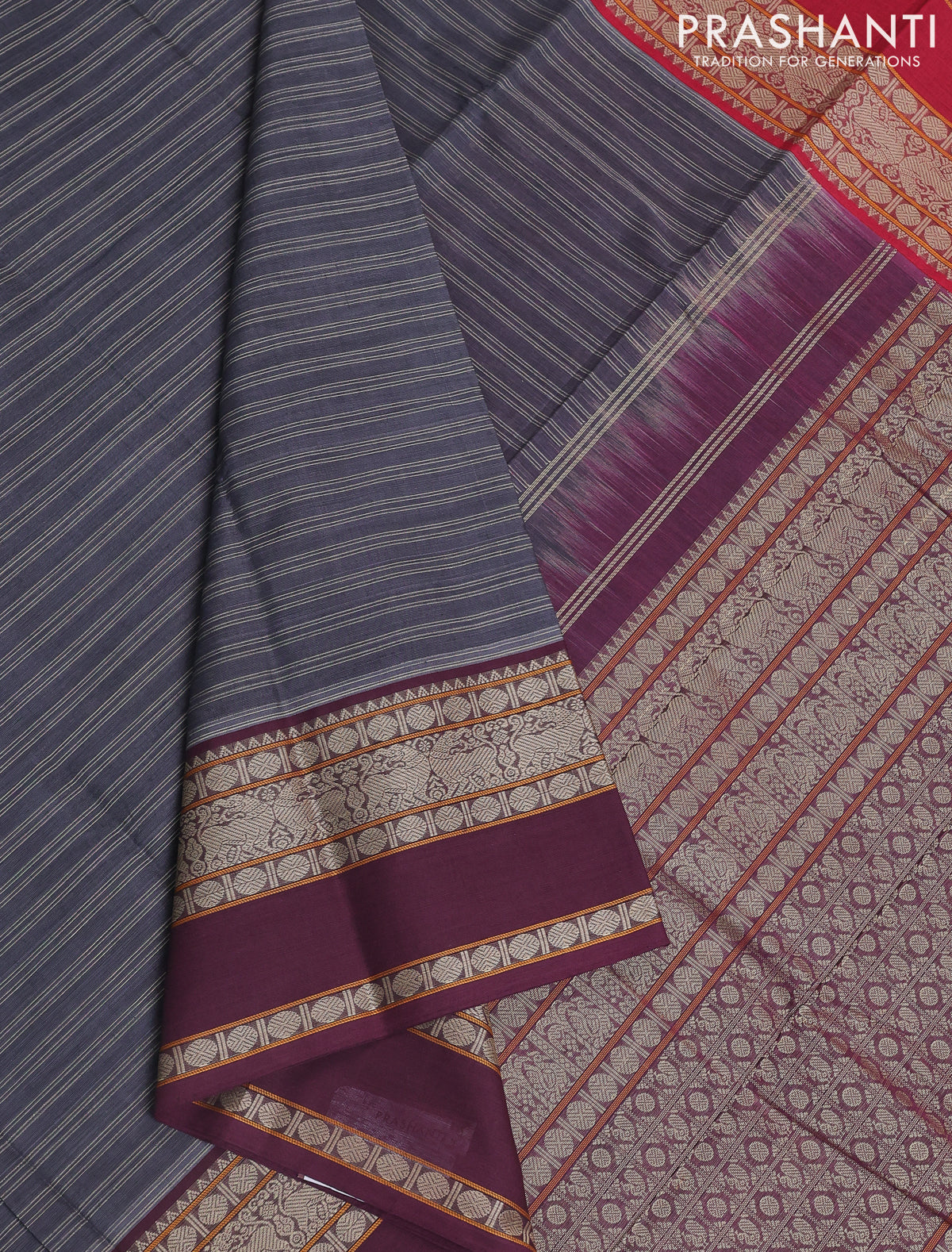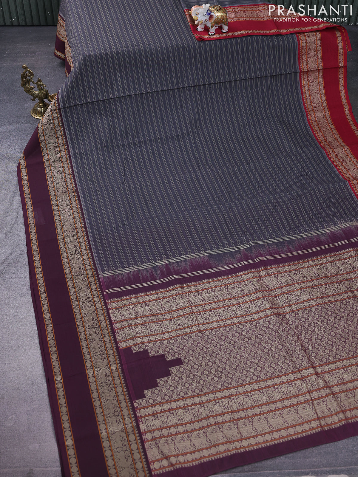 Kanchi cotton saree grey and wine shade with allover stripe pattern and rettapet thread woven border