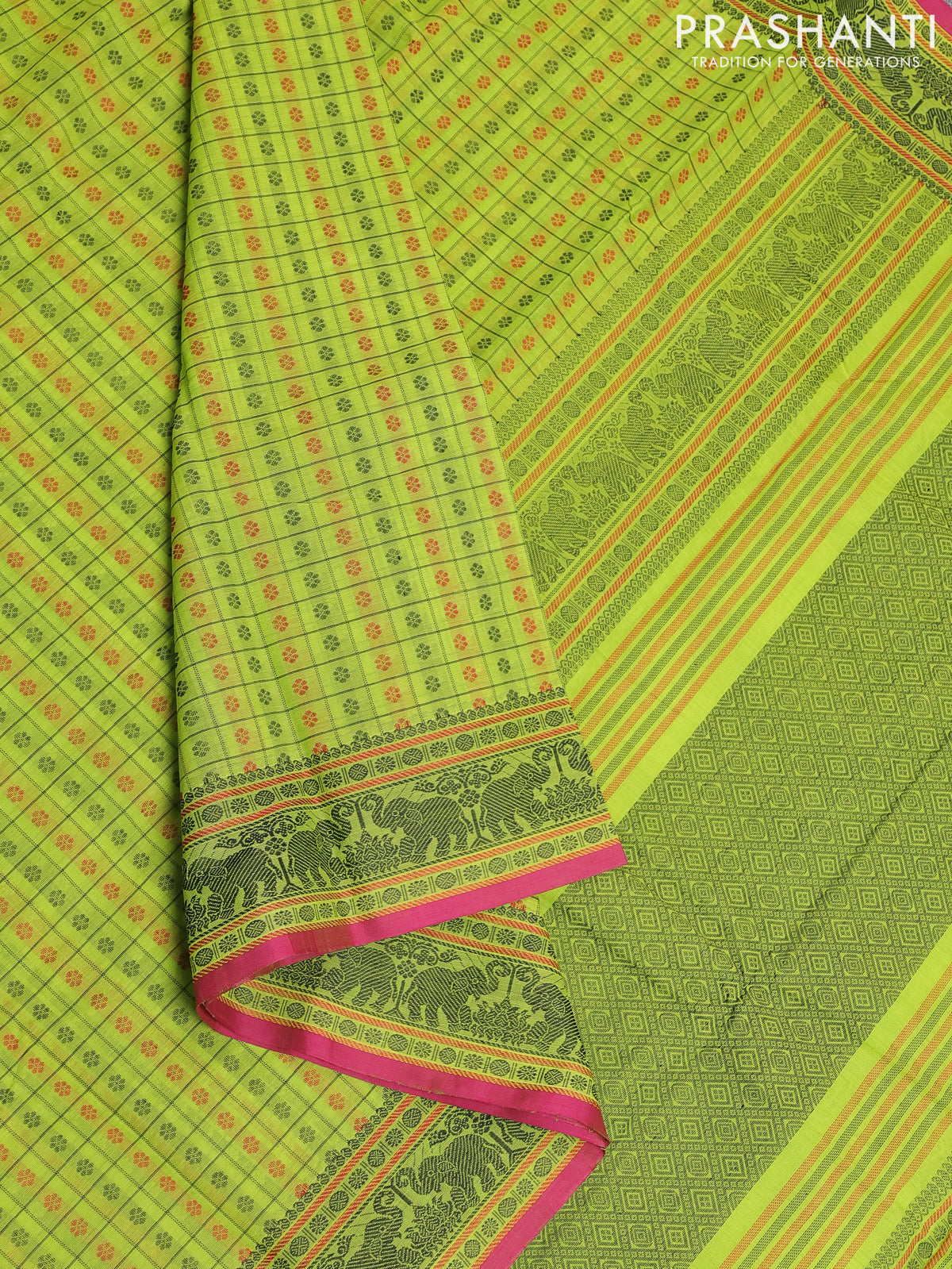 Kanchi cotton saree lime green and pink with allover thread checks & buttas and thread woven border