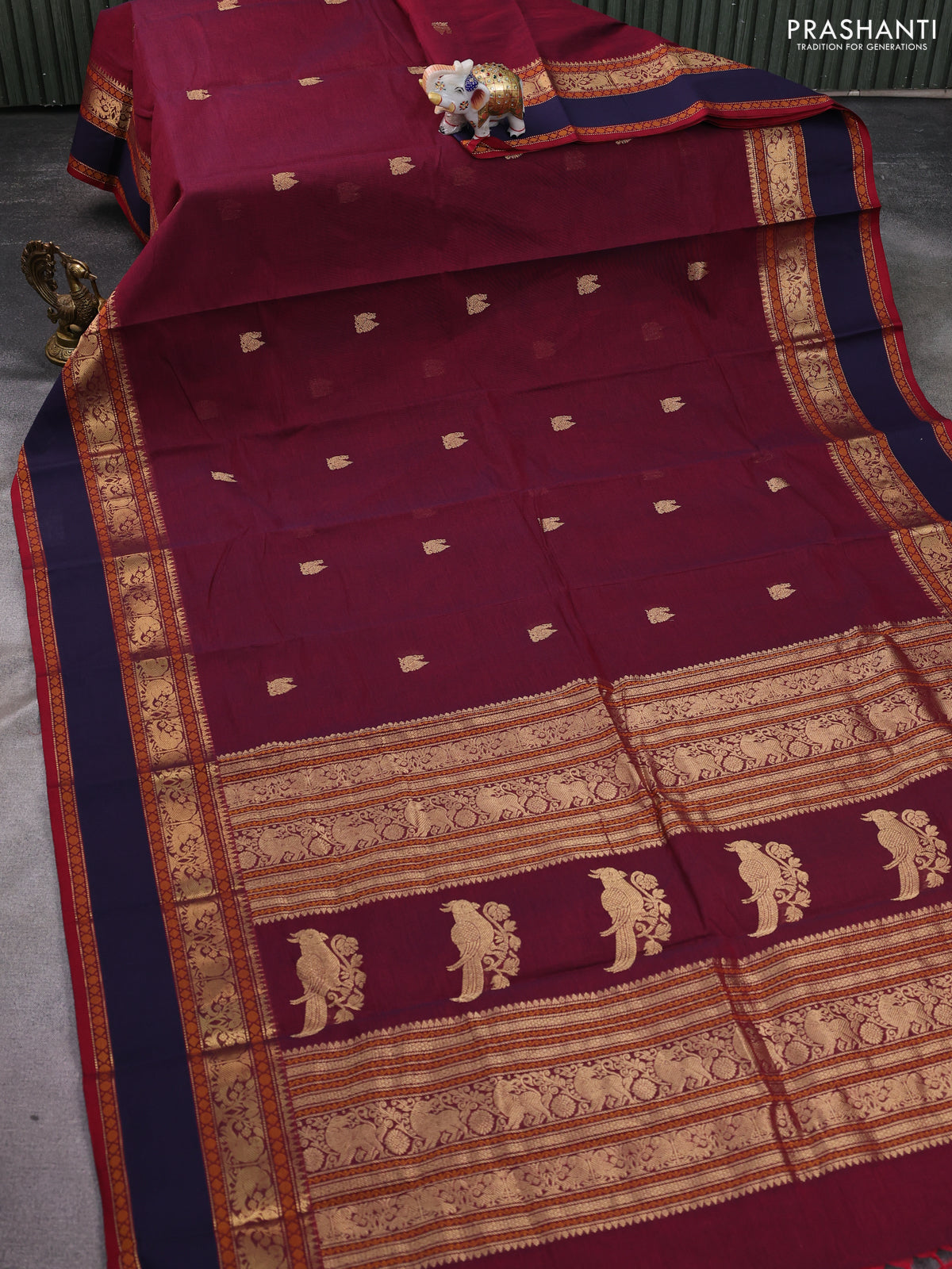 Kanchi cotton saree maroon and navy blue with zari woven annam buttas and rettapet thread & zari woven border