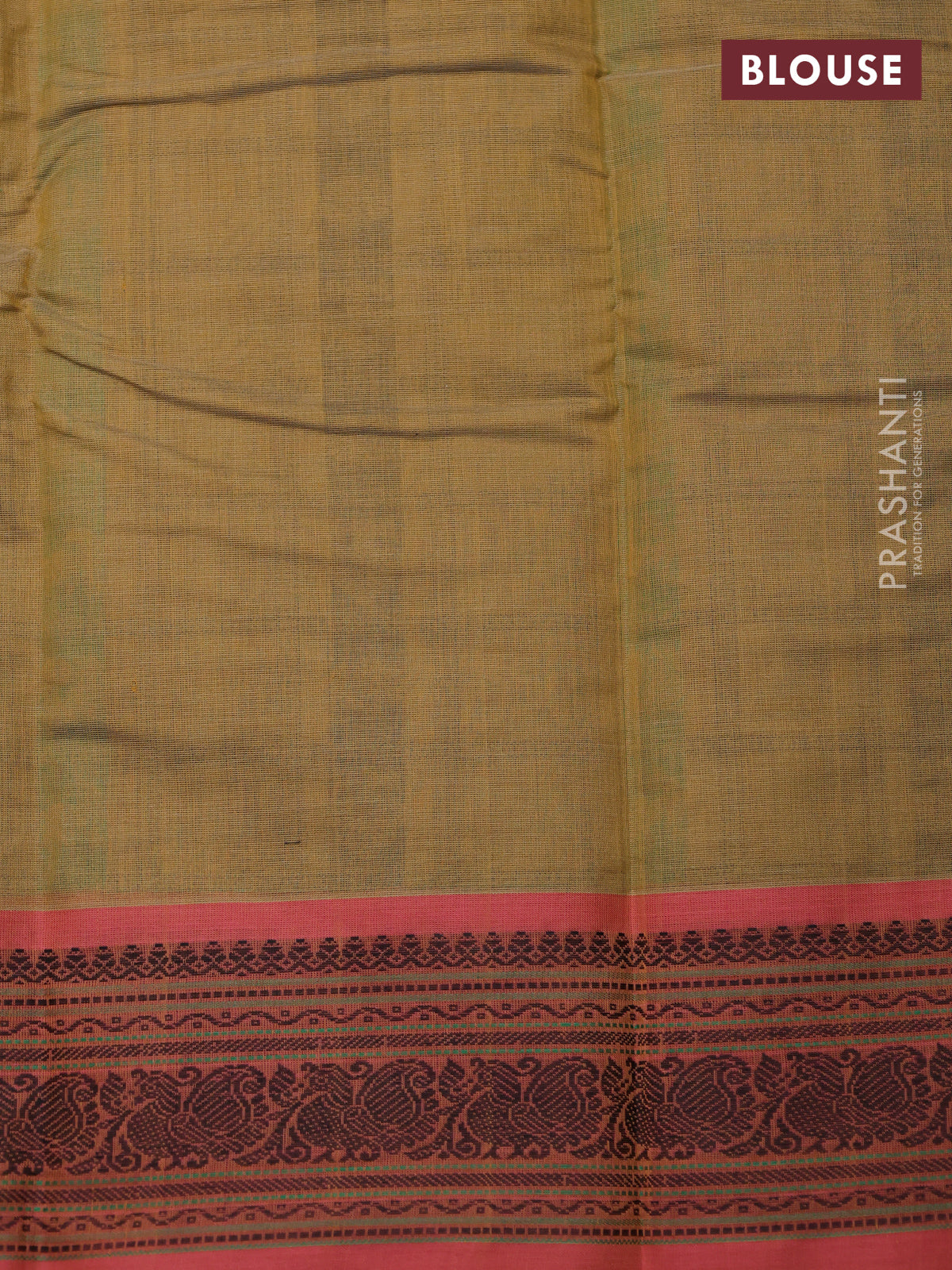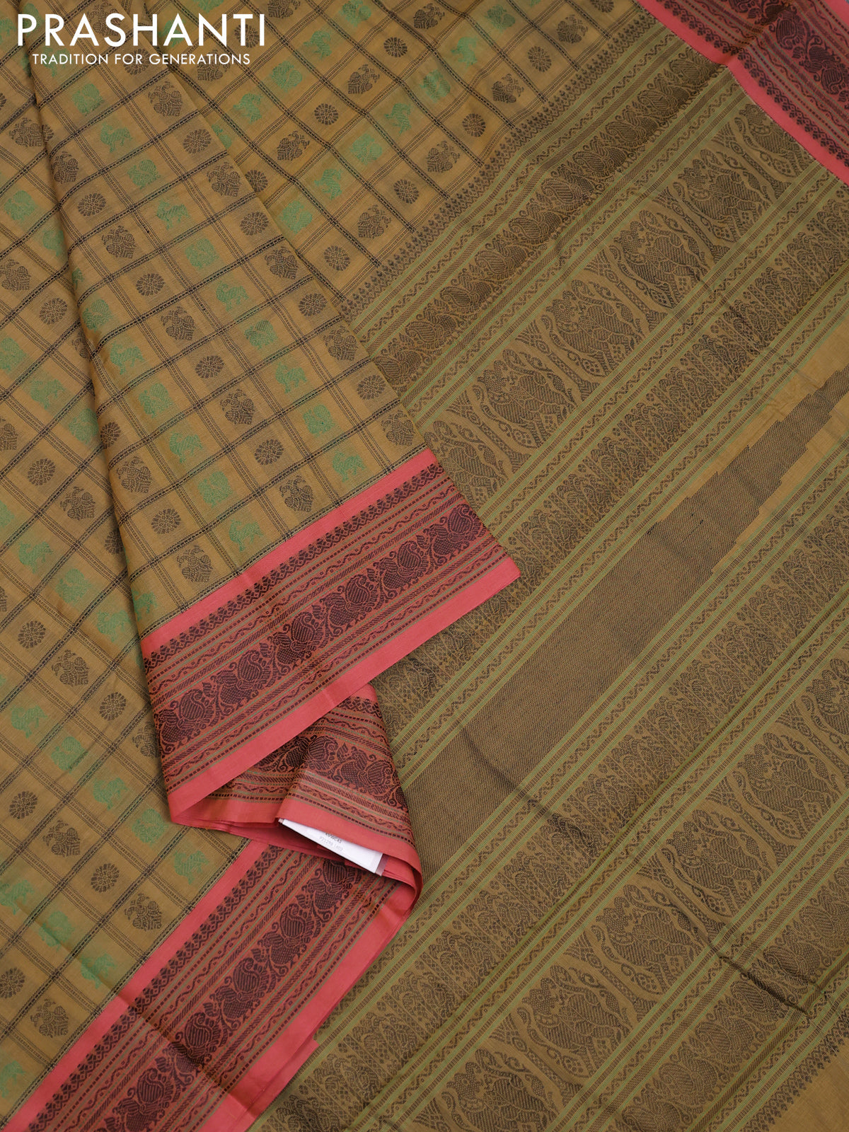 Kanchi cotton saree military green and dual shade of pink with allover checked pattern & buttas and thread woven border