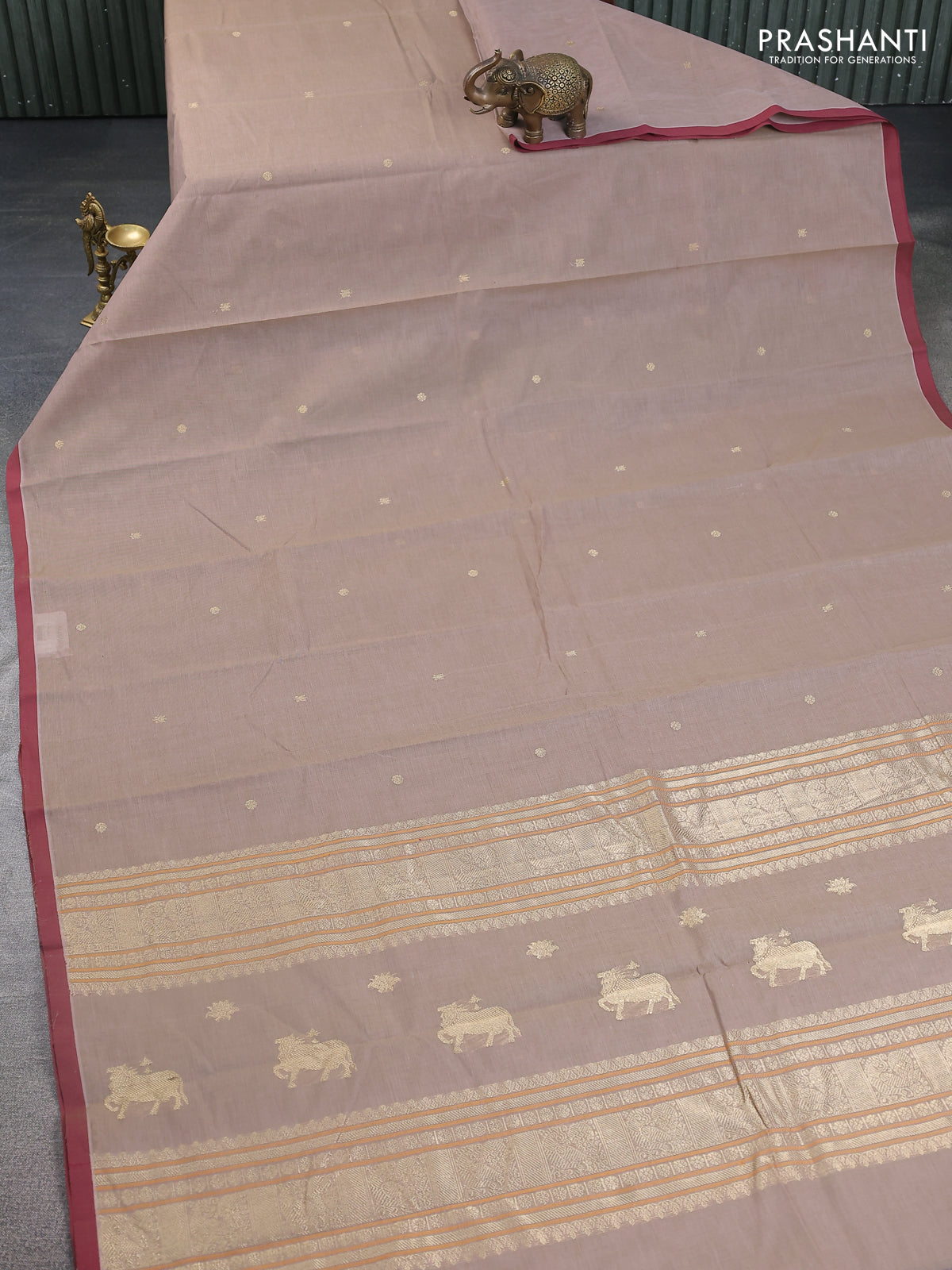 Kanchi cotton saree pastel brown and maroon with zari woven buttas and piping border