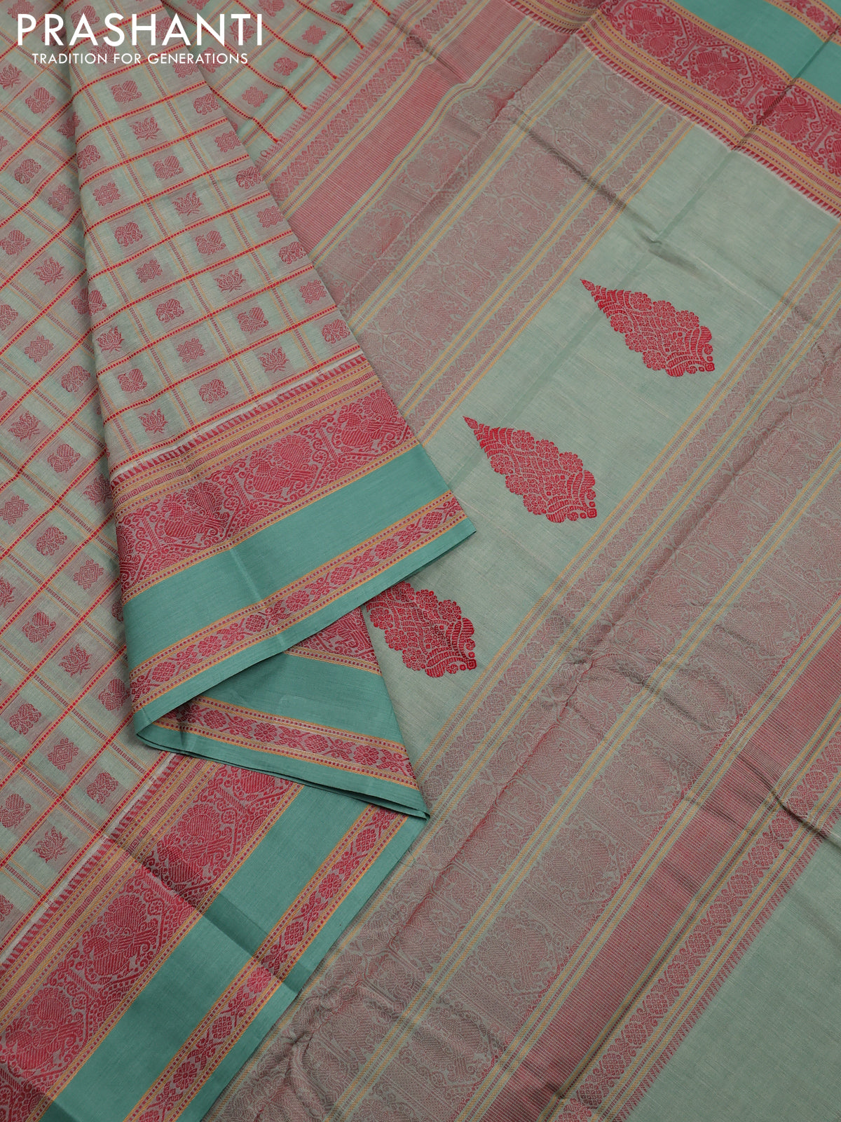 Kanchi cotton saree pastel green with allover checked pattern & buttas and rettapet thread woven border