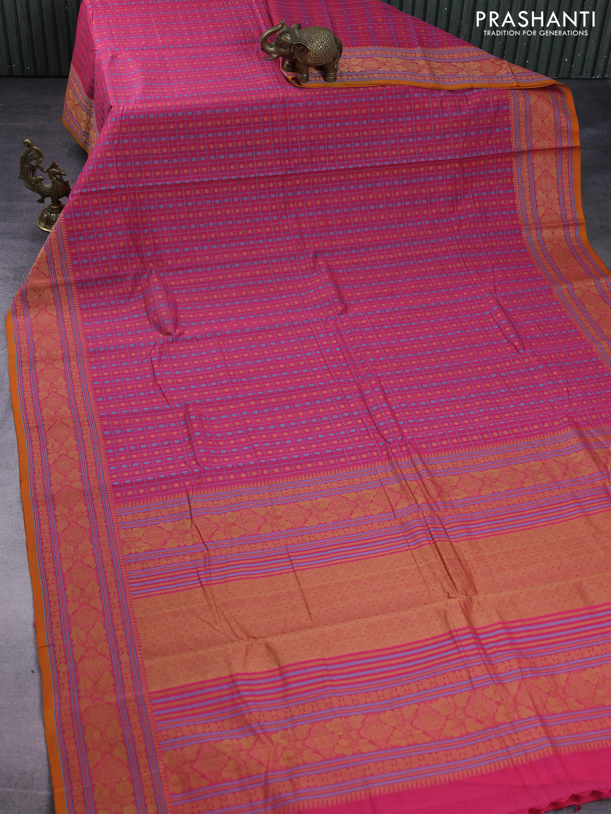 Kanchi cotton saree pink and mustard yellow with allover lakshadeepam weaves and thread woven border