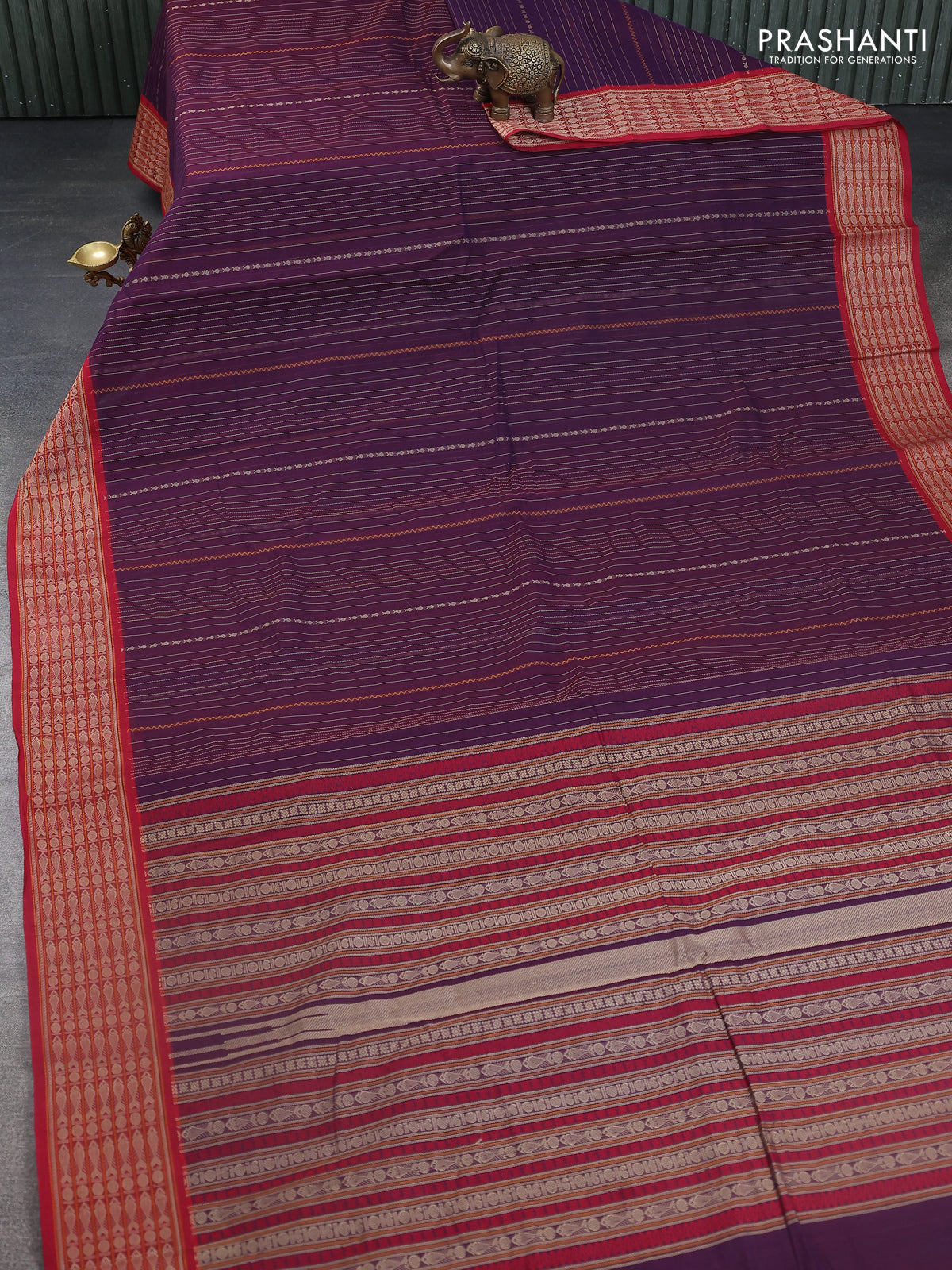 Kanchi cotton saree purple and red with allover thread stripe weaves and thread woven border