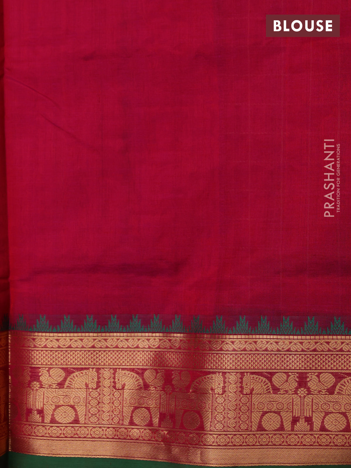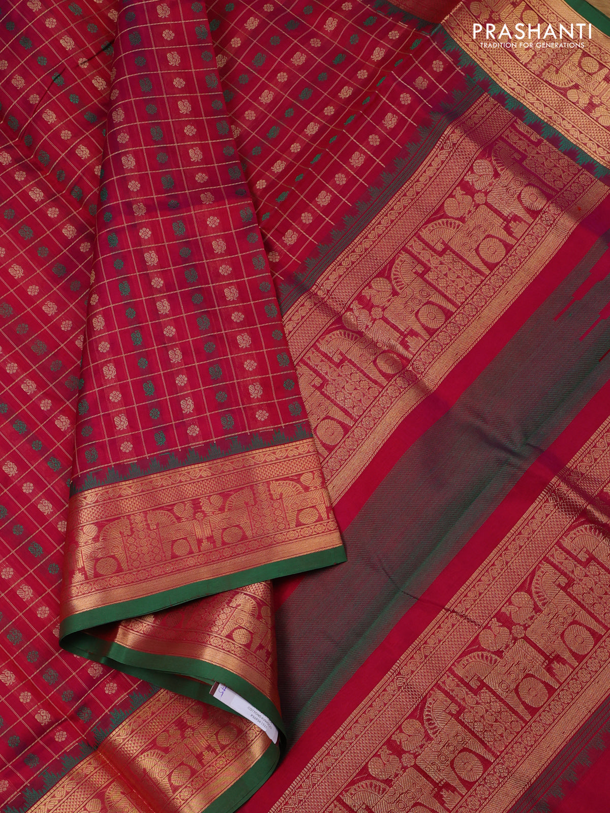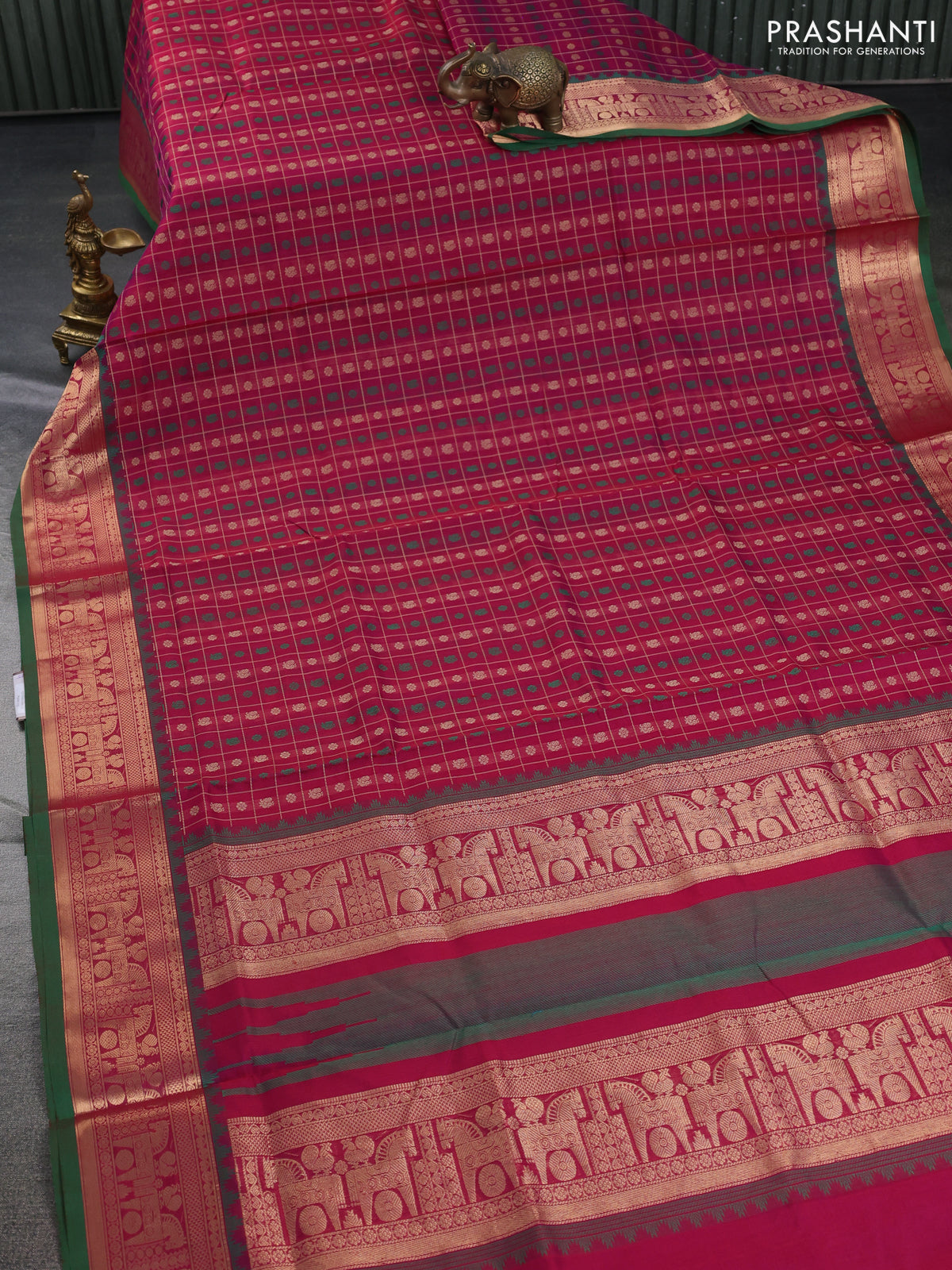 Kanchipuram silk cotton saree magenta pink and green with allover thread checks & buttas and rettapet zari woven border