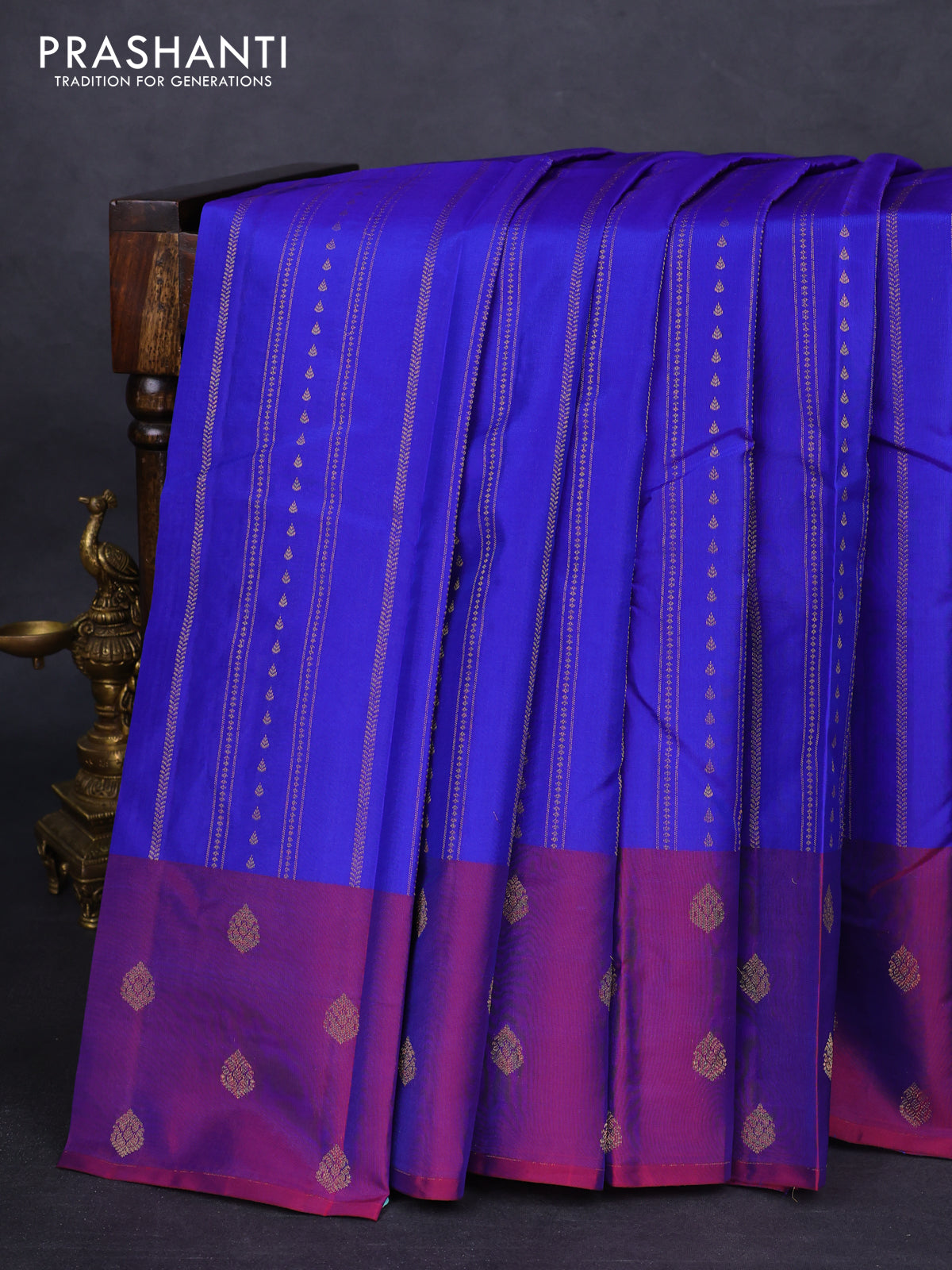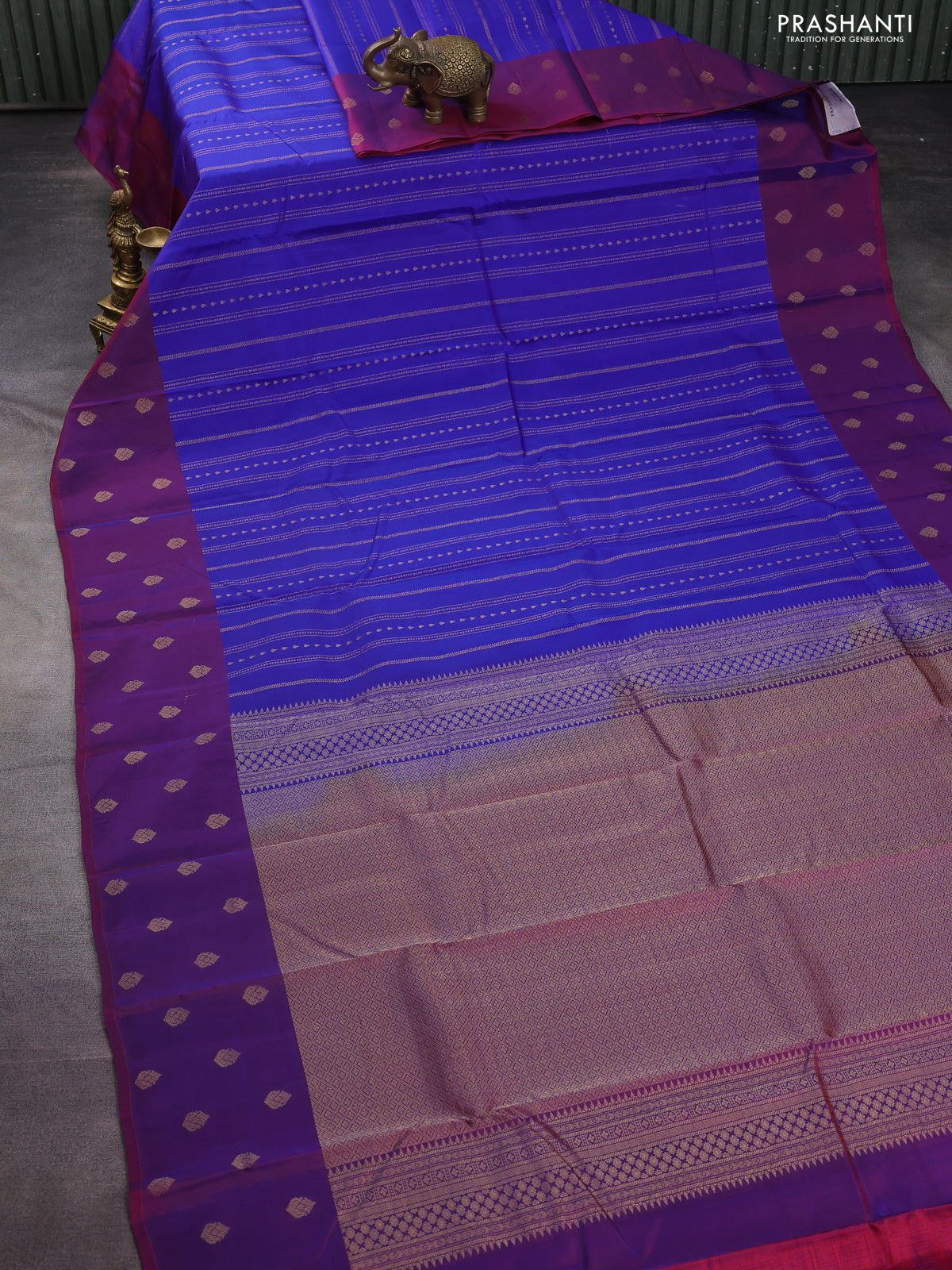 Kanchipuram silk saree blue and dual shade of maroon with allover zari weaves and zari woven butta border