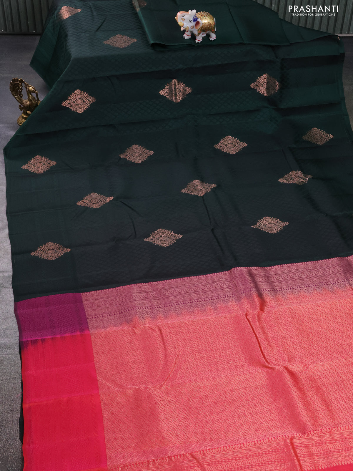 Kanchipuram silk saree bottle green and dual shade of pinkish orange with self emboss & zari buttas in borderless style