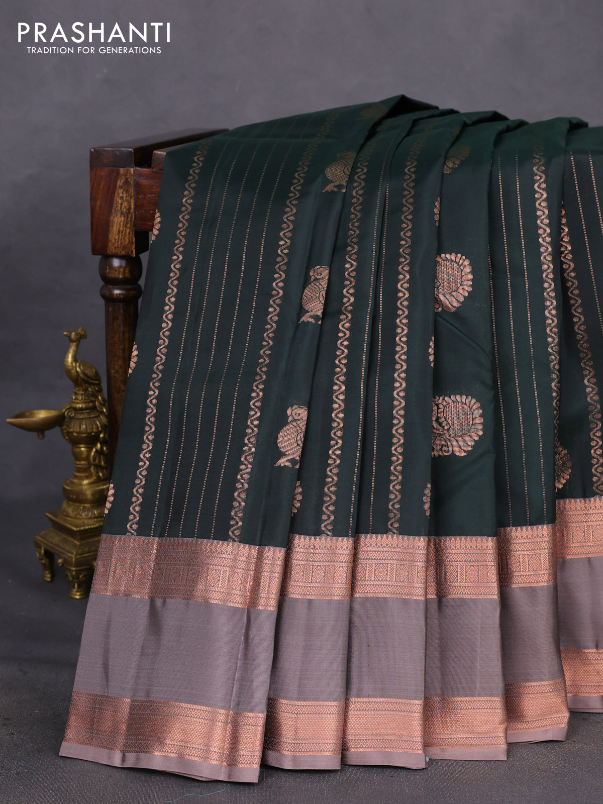 Kanchipuram silk saree bottle green and grey shade with allover copper zari weaves and rettapet copper zari woven border