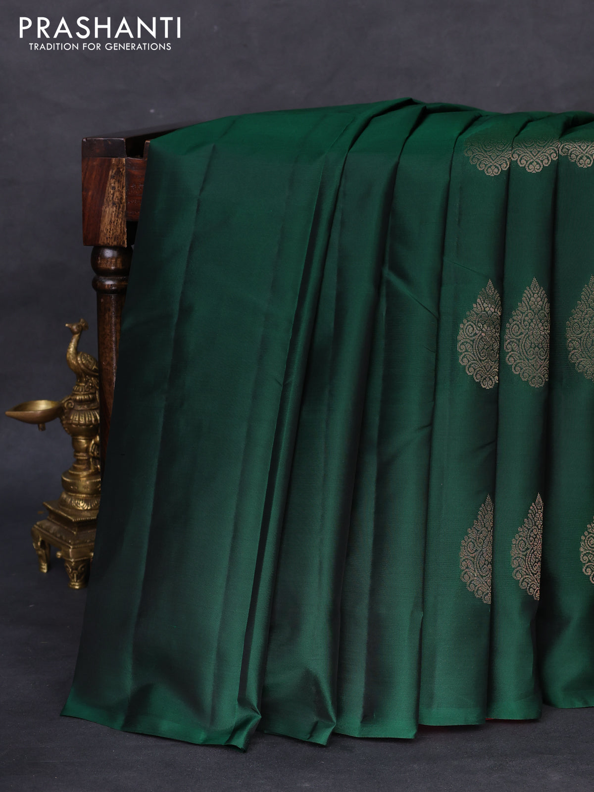 Kanchipuram silk saree bottle green and pink with zari woven buttas in borderless style