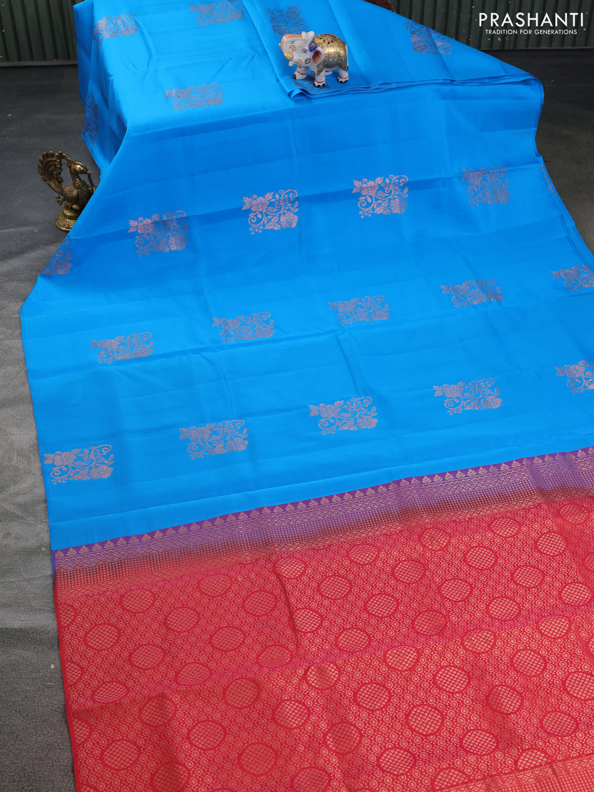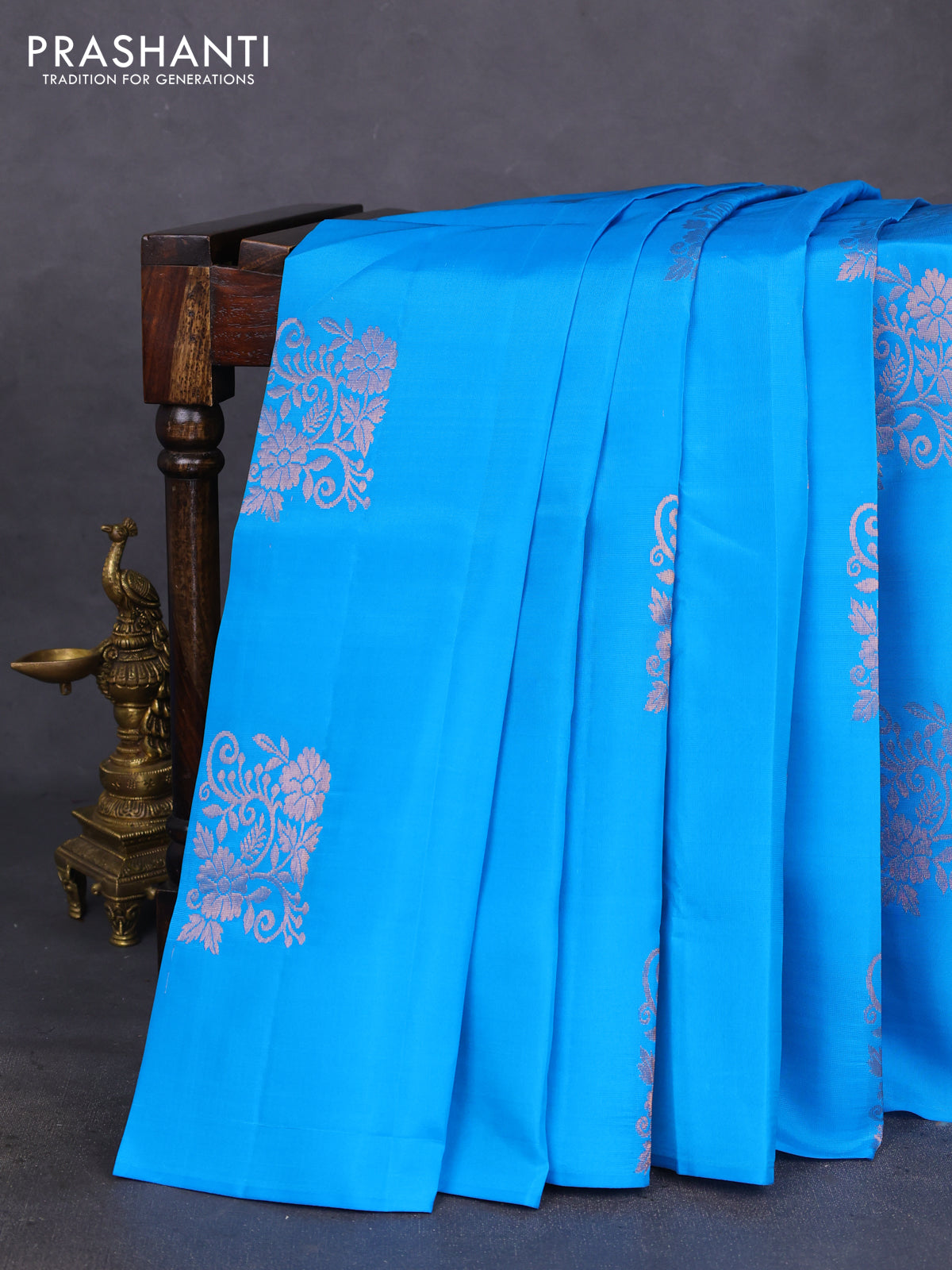 Kanchipuram silk saree cs blue and dual shade of pinkish orange with copper zari woven buttas in borderless style
