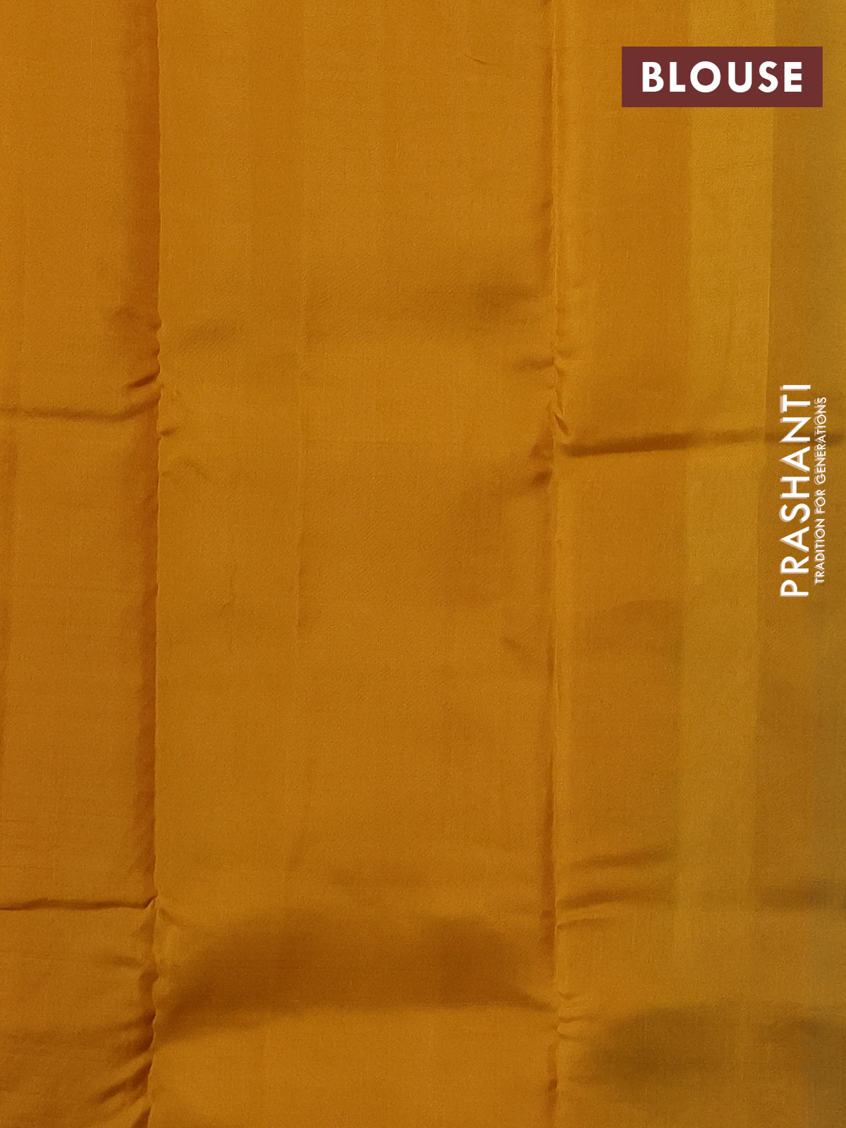 Kanchipuram silk saree cs blue and mustard yellow with copper zari woven buttas in borderless style