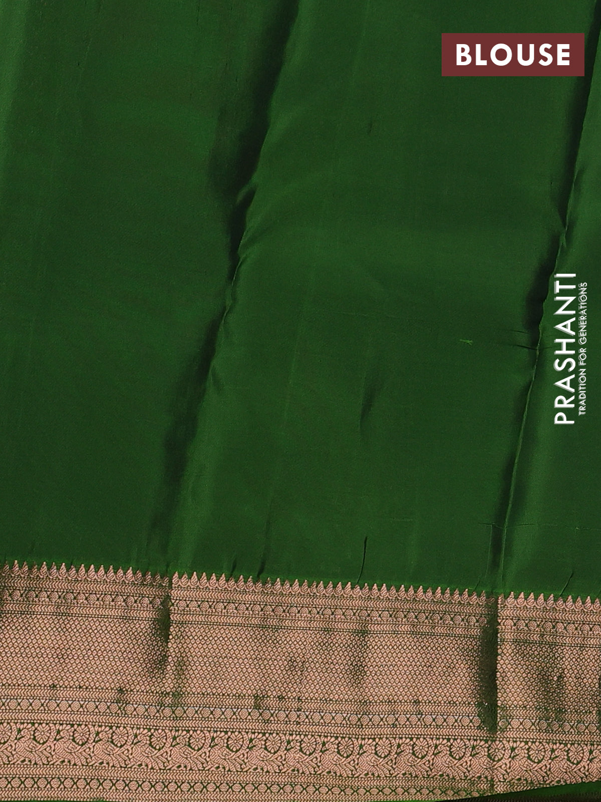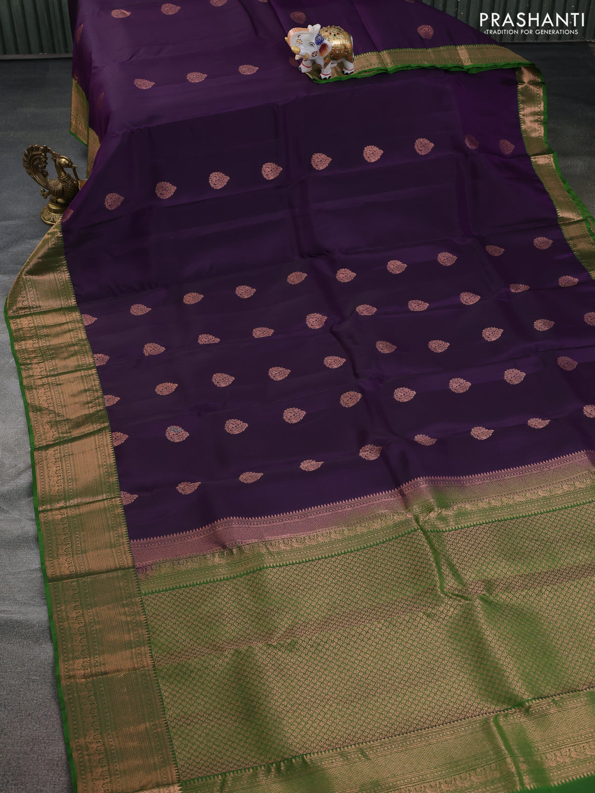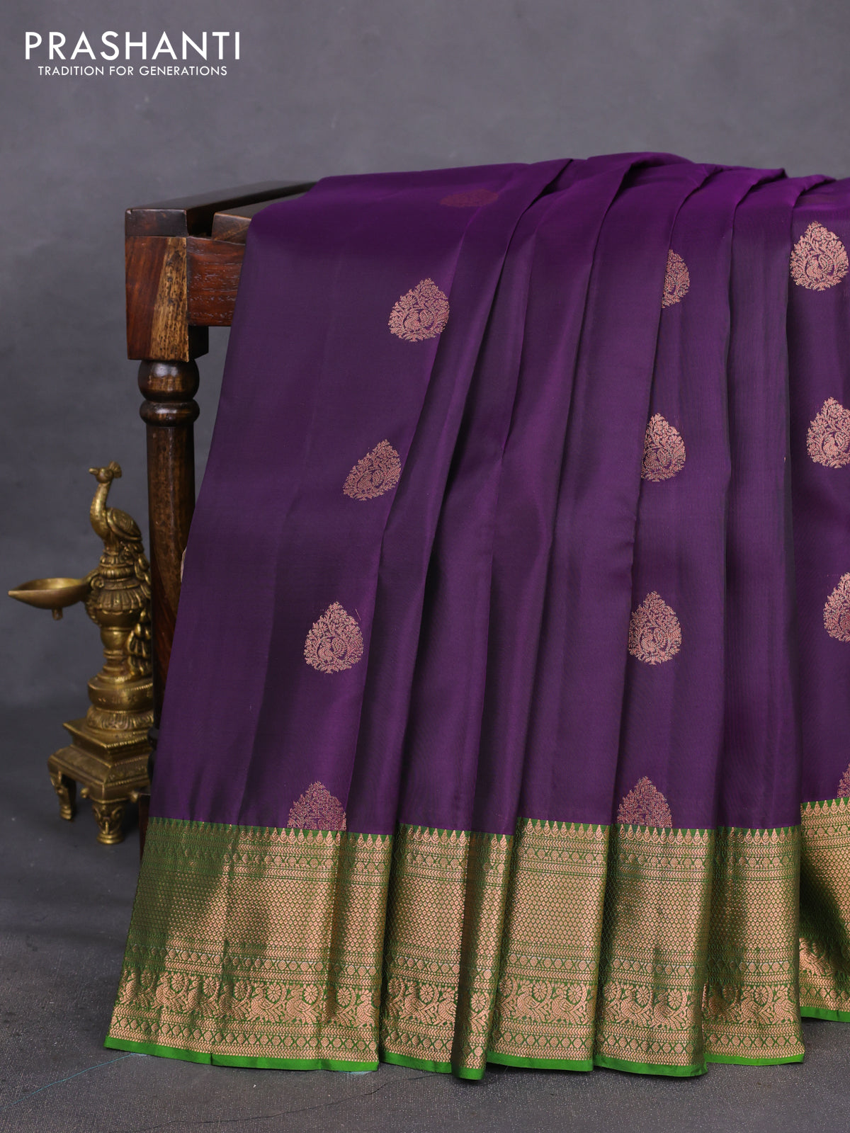 Kanchipuram silk saree deep violet and green with copper zari woven buttas and copper zari woven border