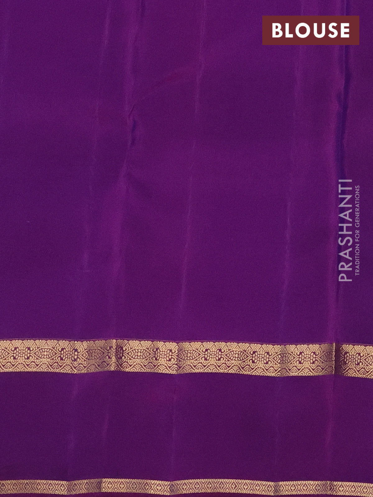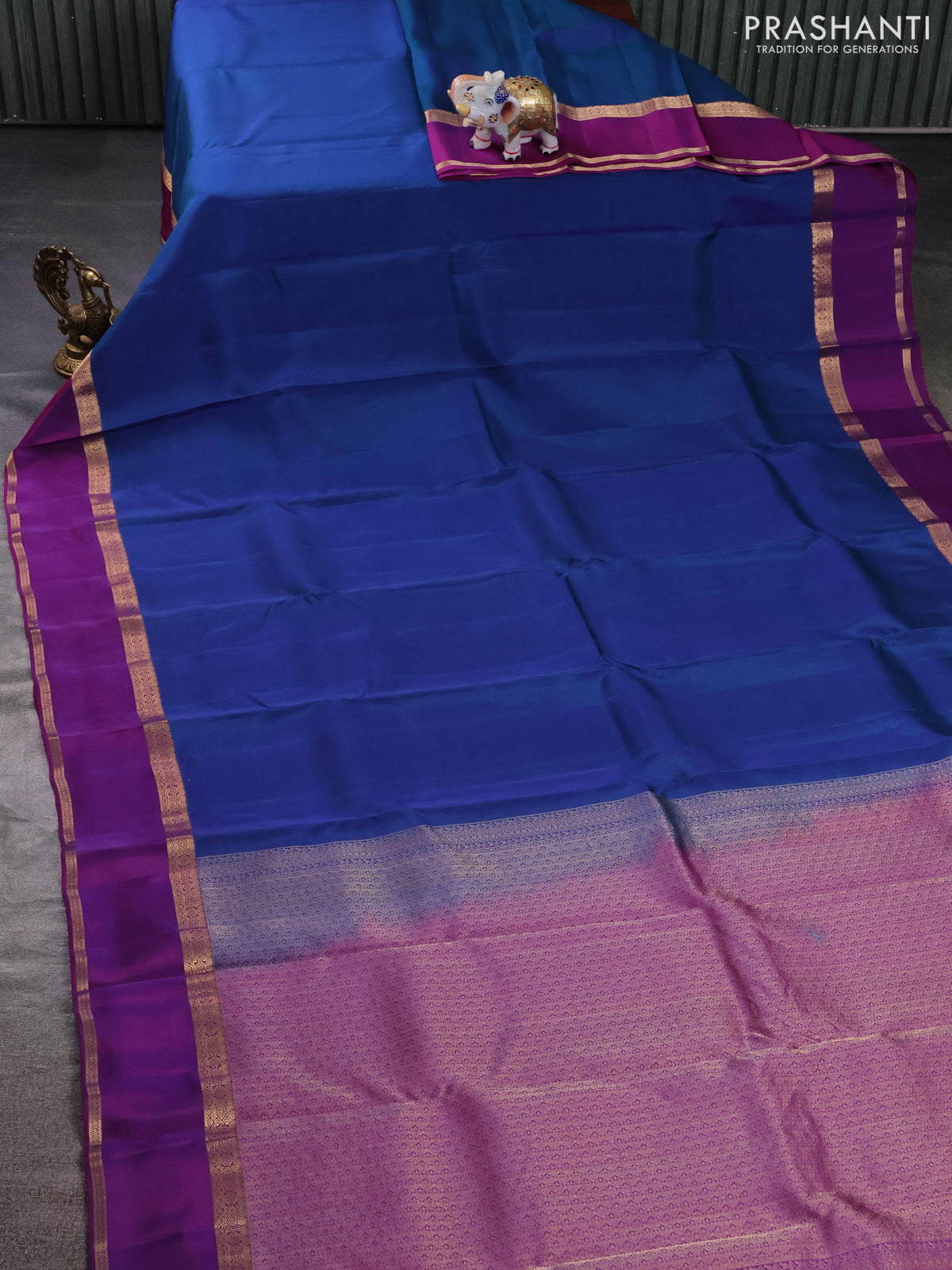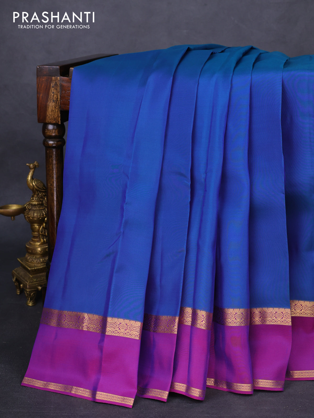 Kanchipuram silk saree dual shade of bluish green and purple with plain body and rettapet zari woven border