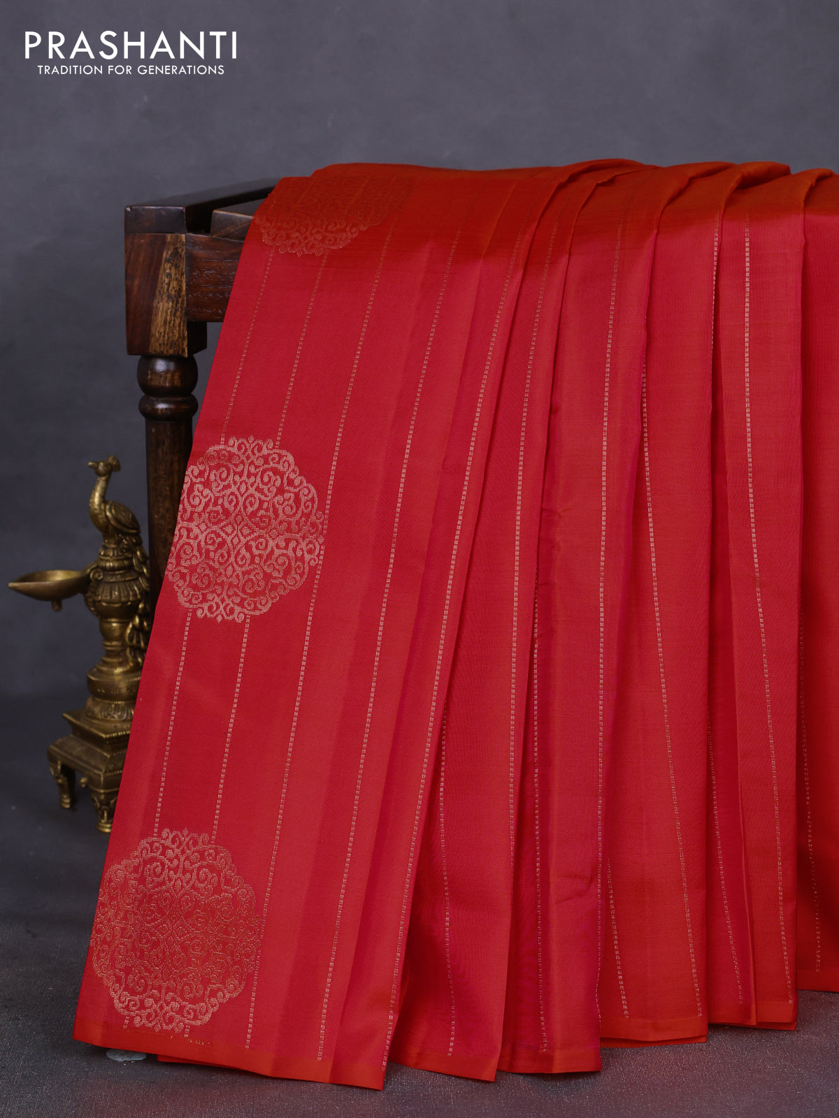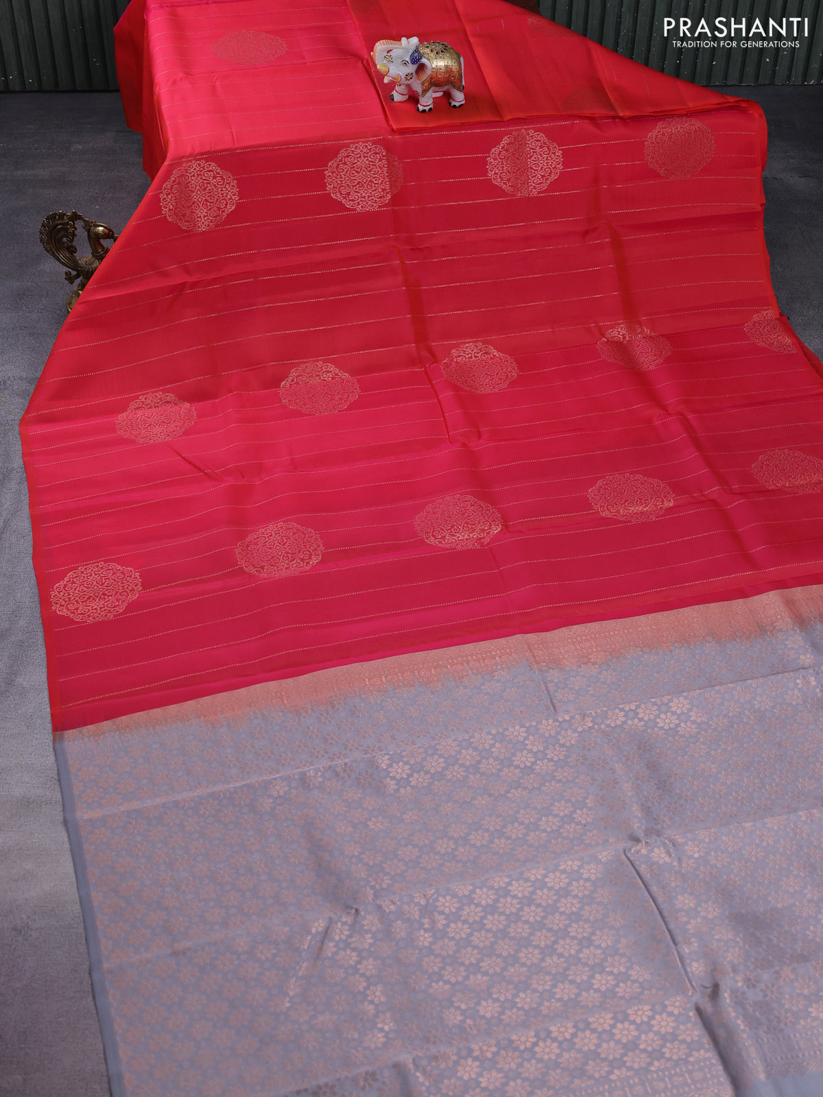 Kanchipuram silk saree dual shade of pink and grey with allover copper zari weaves in borderless style