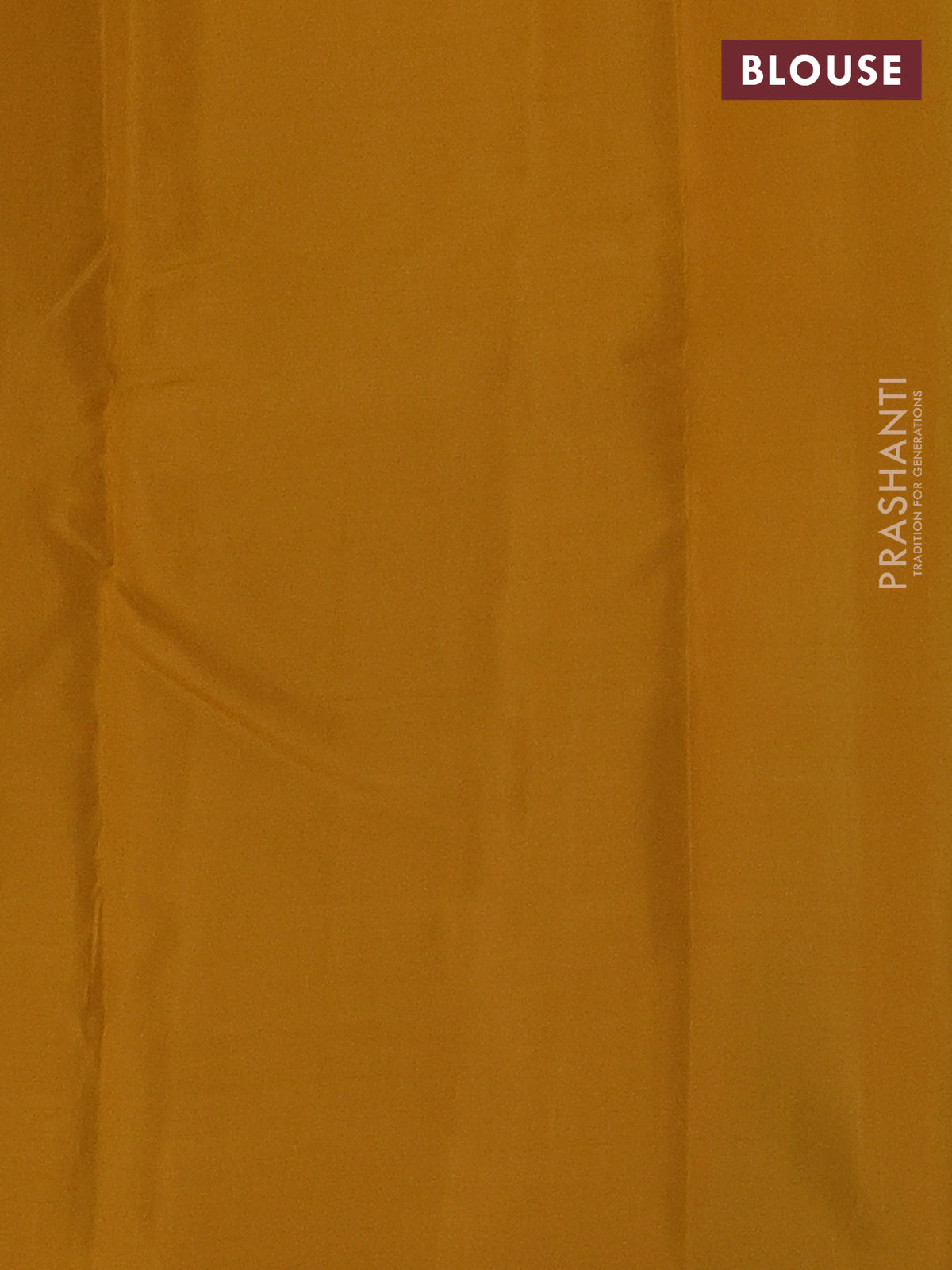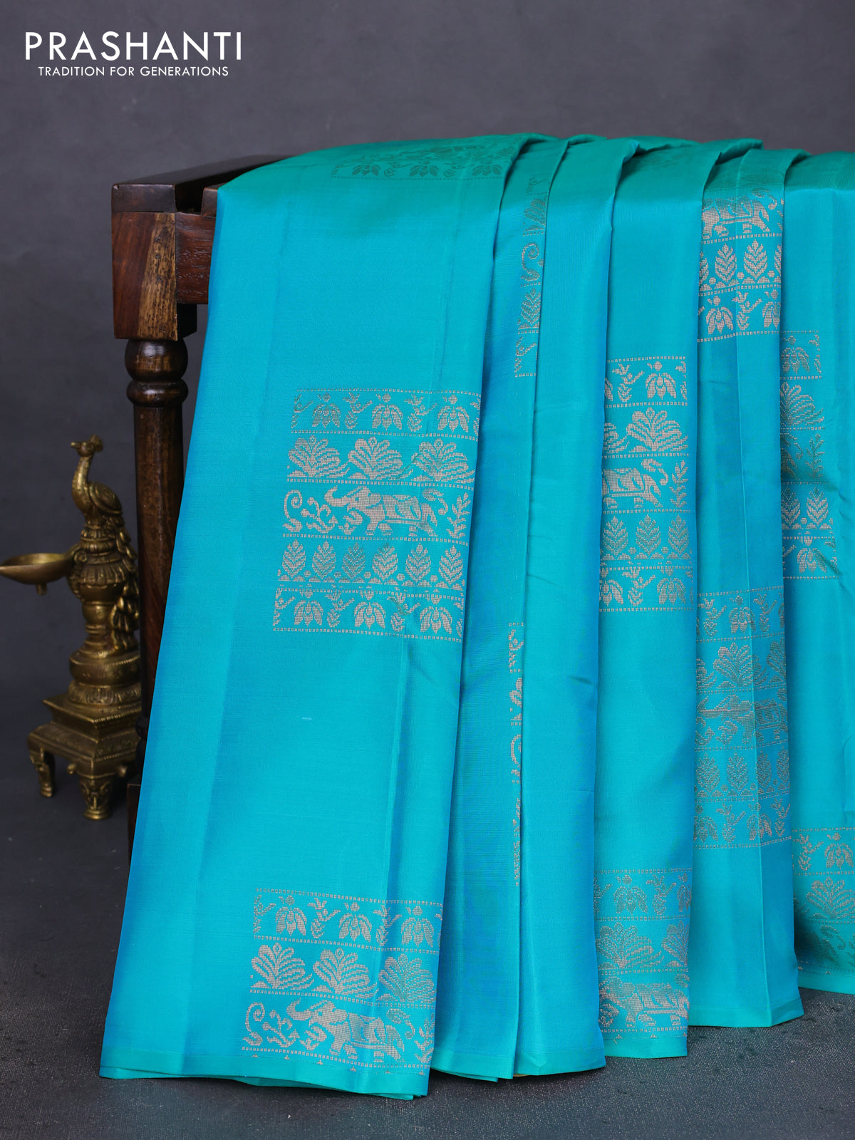 Kanchipuram silk saree dual shade of teal greenish blue and mustard yellow with copper zari woven buttas in borderless style