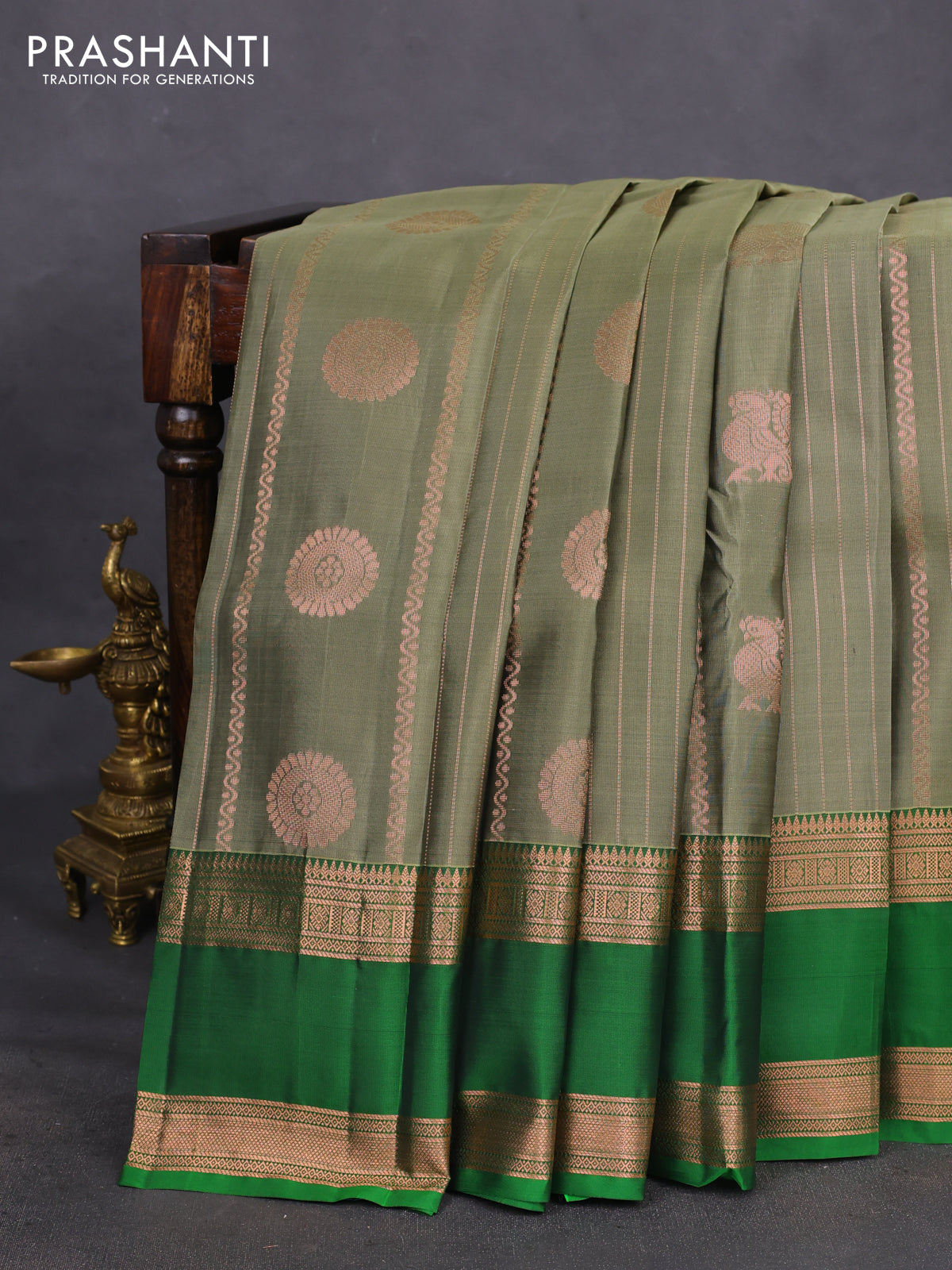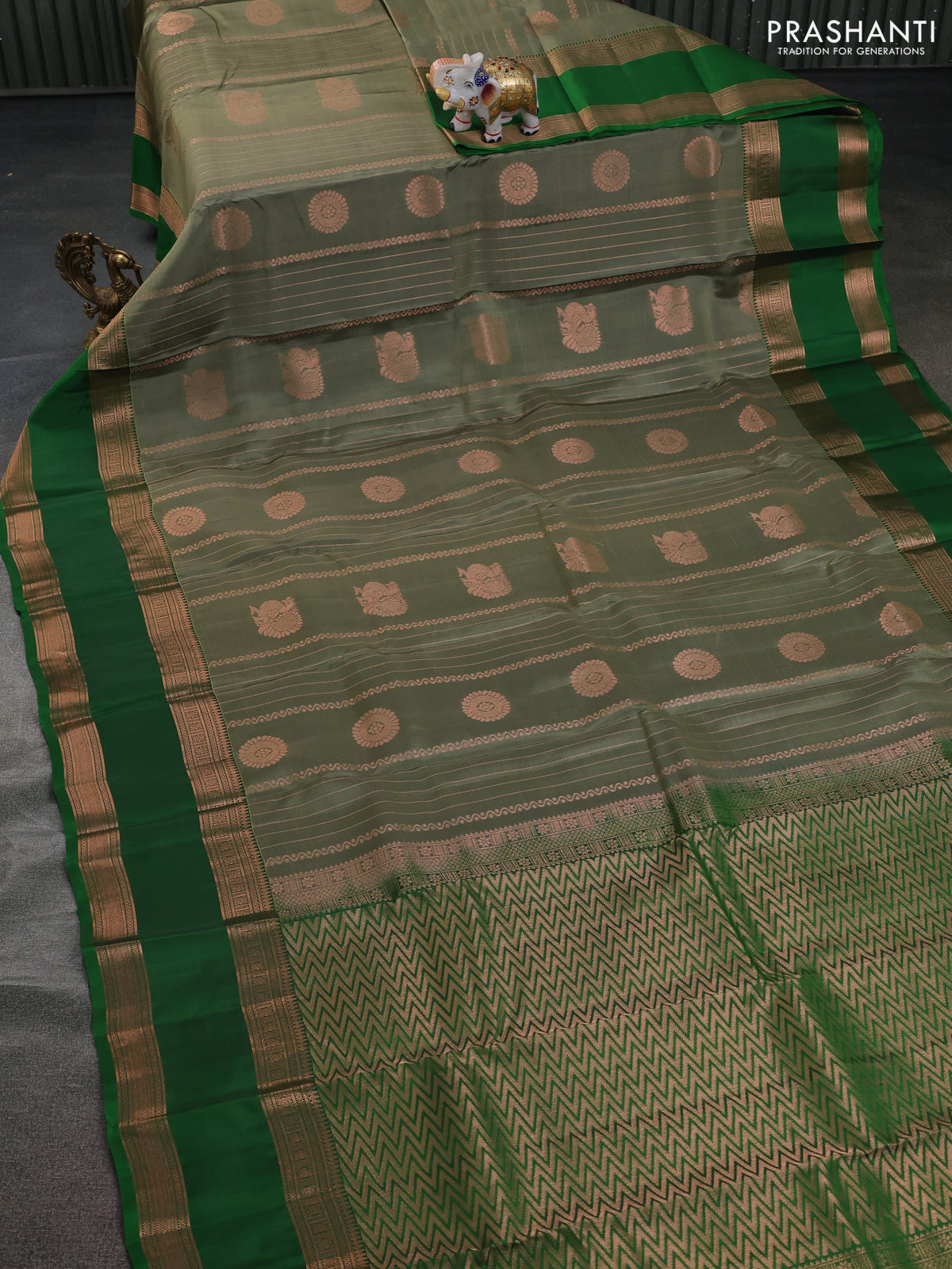 Kanchipuram silk saree elaichi green and green with allover copper zari weaves & buttas and rettapet copper zari woven border