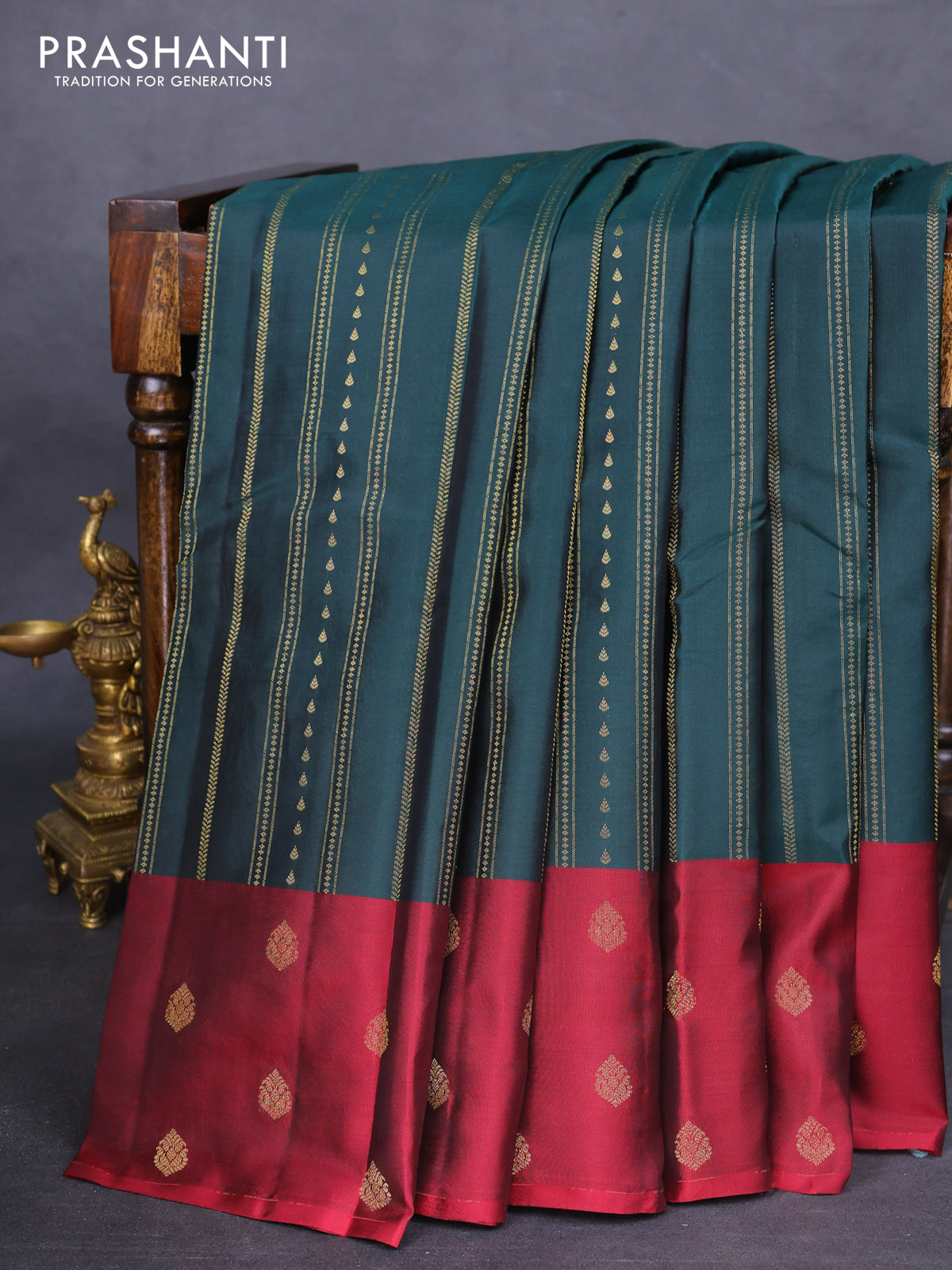 Kanchipuram silk saree green and maroon with allover zari weaves and zari woven butta border