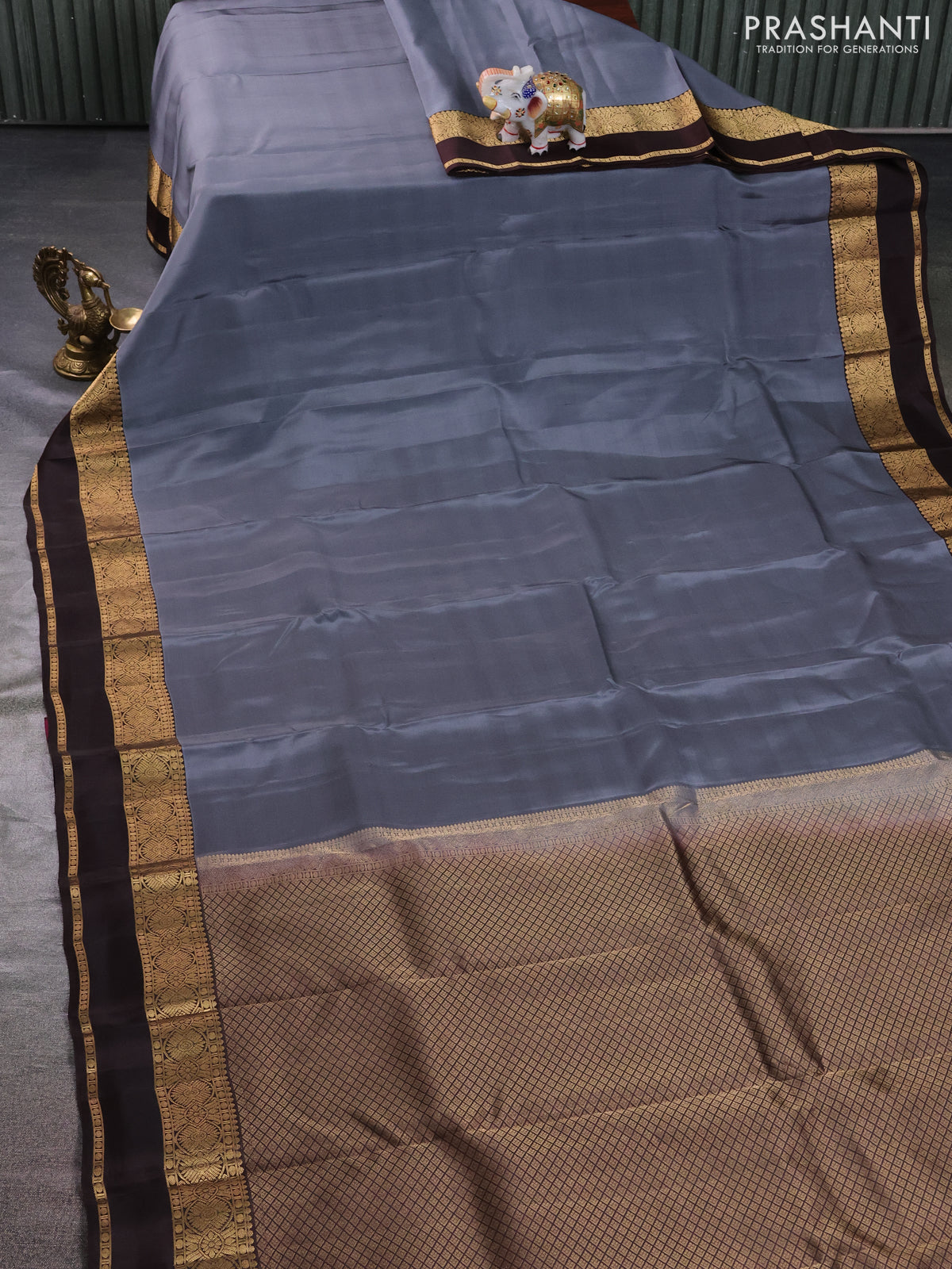 Kanchipuram silk saree grey and brown with plain body and rettapet zari woven border
