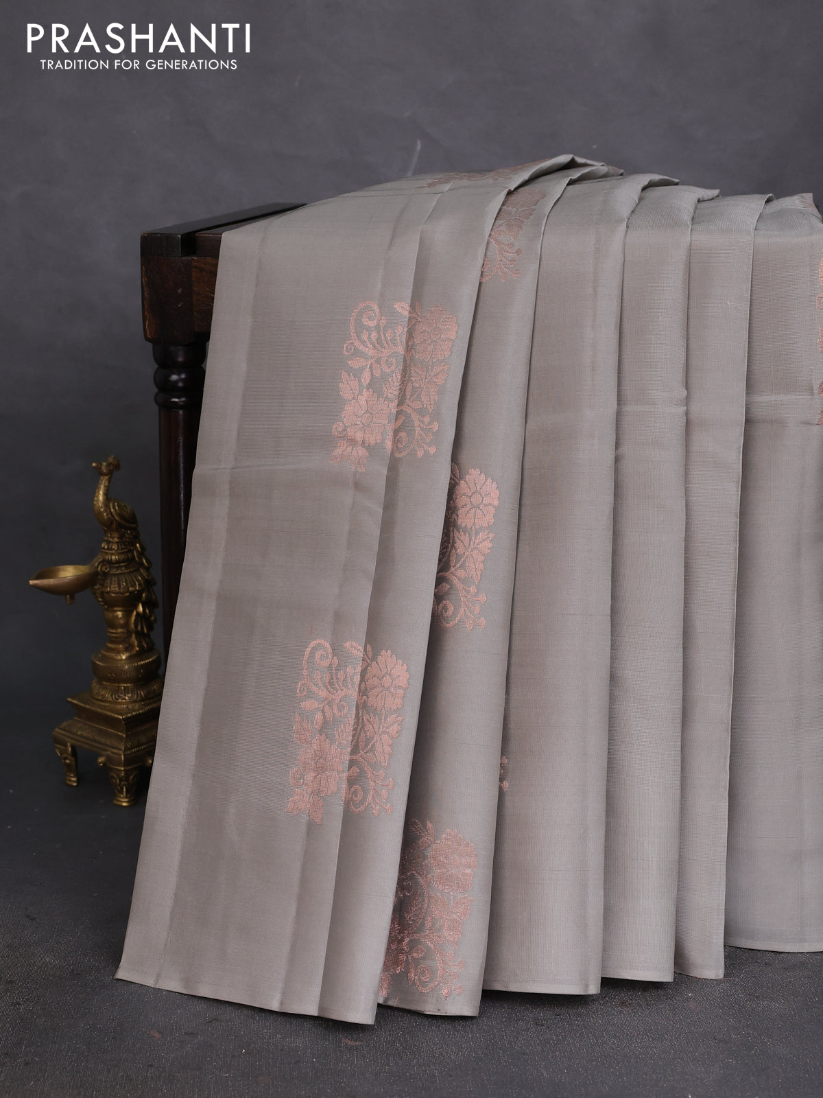 Kanchipuram silk saree grey and dual shade of pinkish orange with copper zari woven floral buttas in borderless style