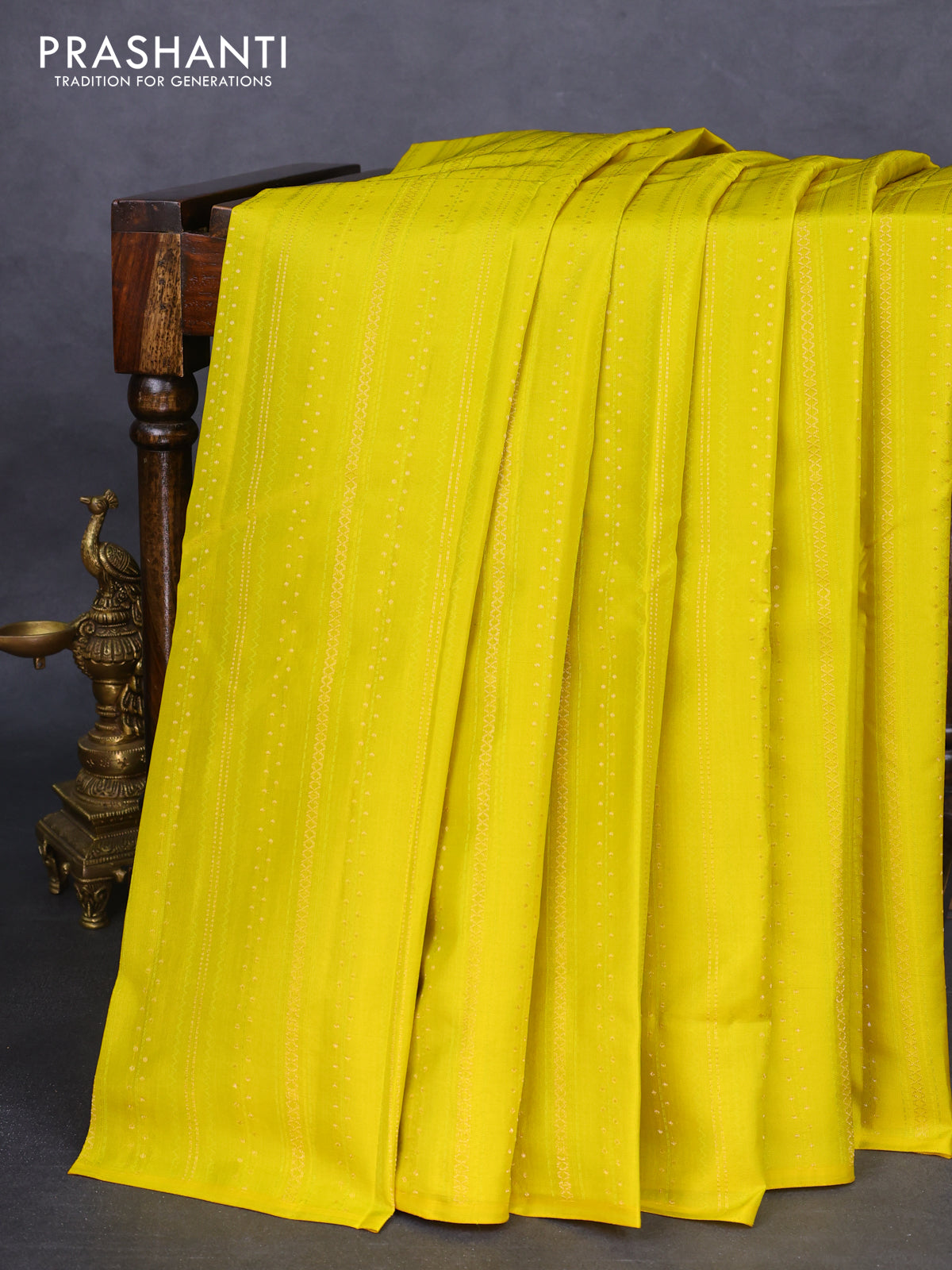 Kanchipuram silk saree lime yellow and bottle green with allover zari weaves & self emboss in borderless style