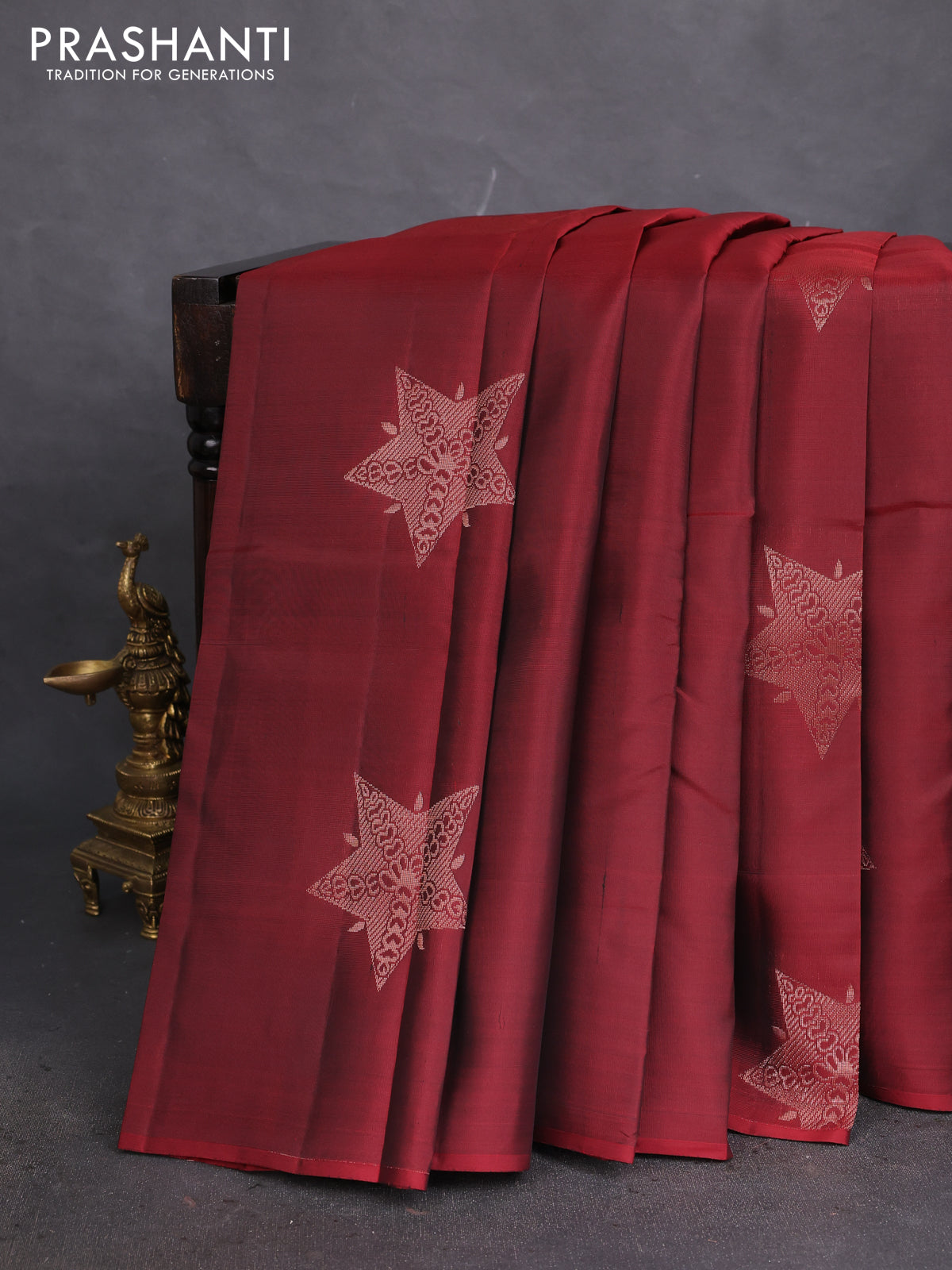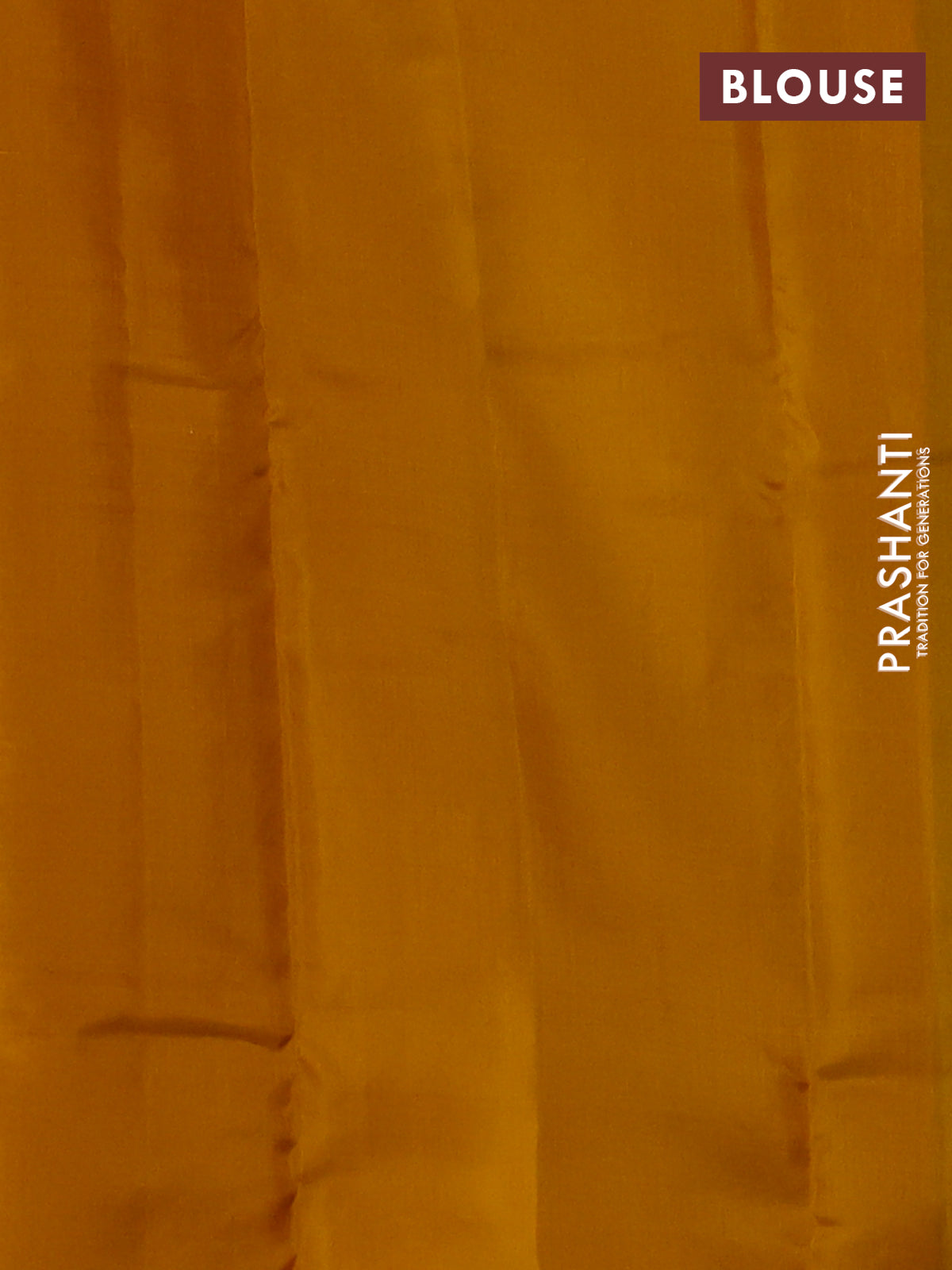 Kanchipuram silk saree maroon and dark mustard yellow with copper zari woven buttas in borderless style