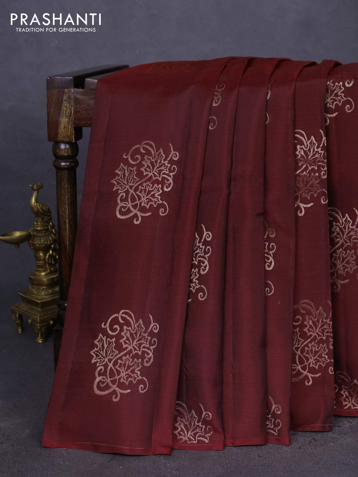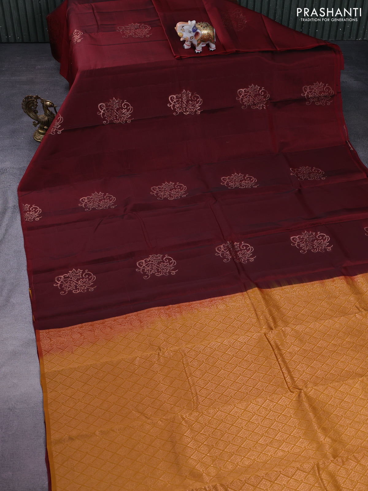 Kanchipuram silk saree maroon and mustard yellow with copper zari woven buttas in borderless style